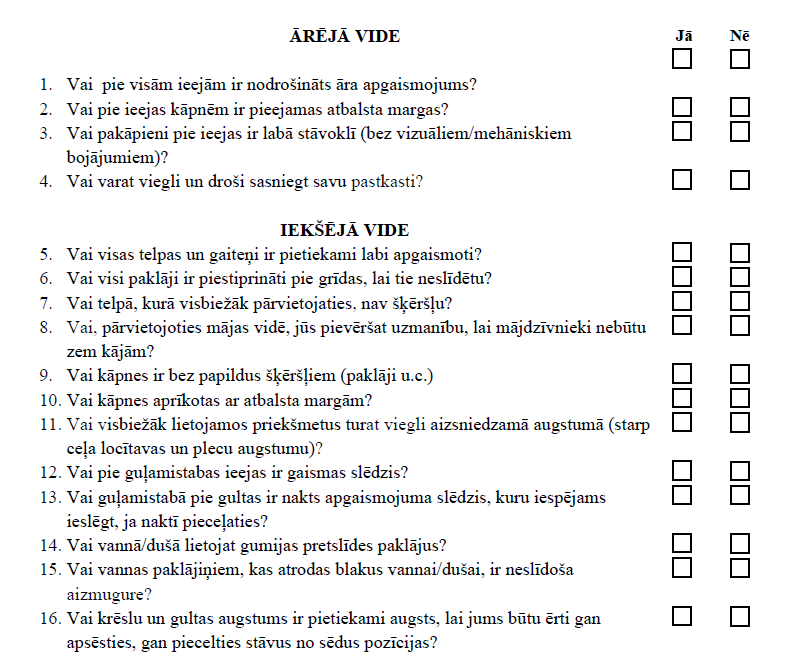 Neatkarīgi no tā, vai pacients dzīvo mājā vai dzīvoklī, lai mājvietā justos droši, tā ir jāpielāgo. Tas var ietvert spilgtāka apgaismojuma uzstādīšanu, mēbeļu pārvietošanu u.c. Ergoterapeite aicina novērtēt mājas vides drošību, aizpildot anketu:
