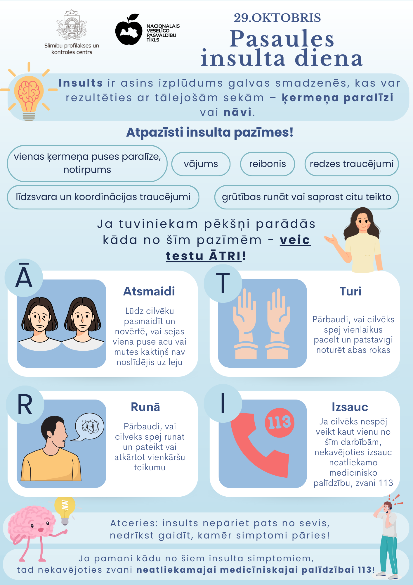 Pasaules insulta dienā aicinām iepazīties ar Slimību profilakses un kontroles centa (SPKC) un Veselības ministrijas izstrādātiem informatīviem materiāliem saistībā ar tēmu.