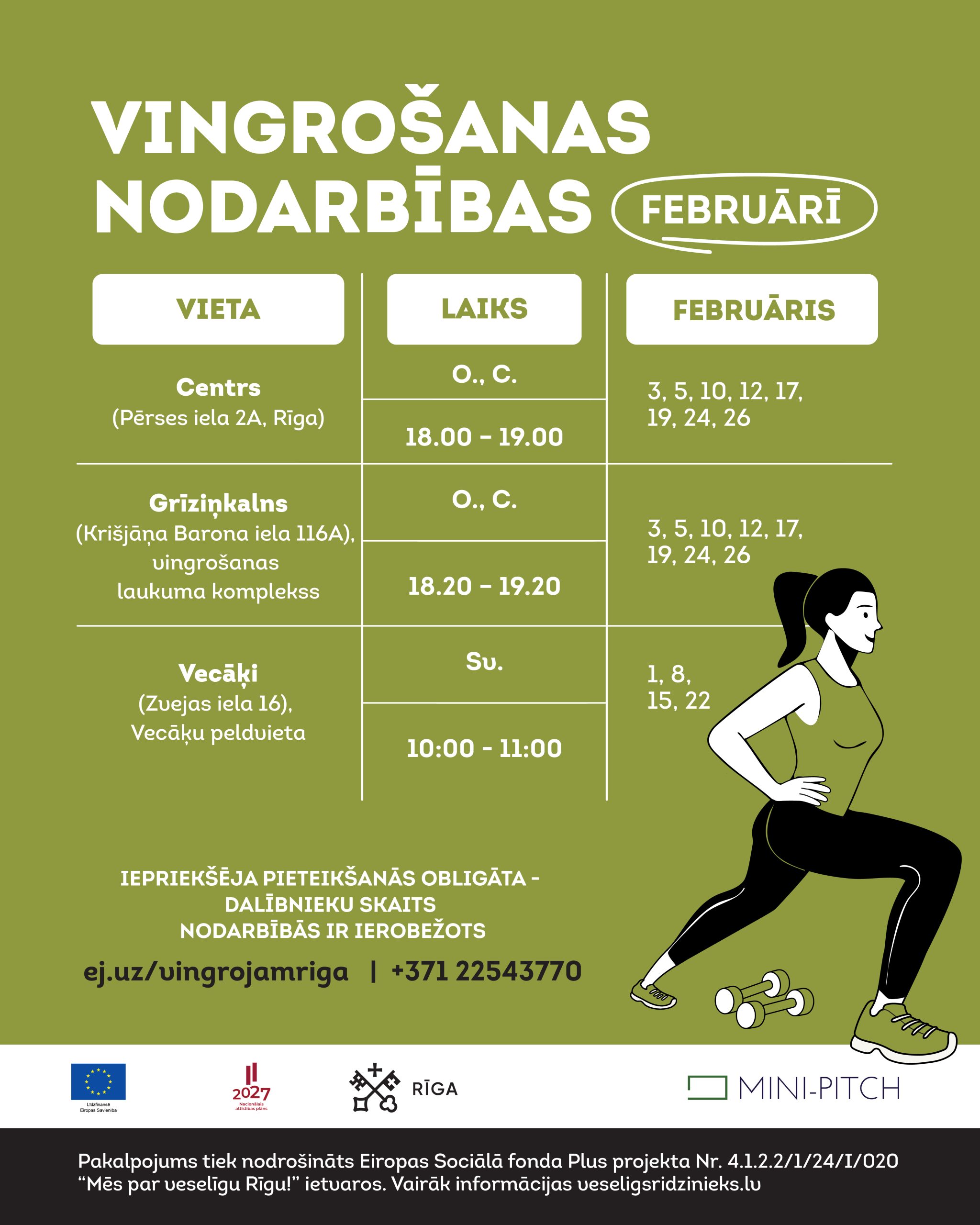 Dalībnieku skaits nodarbībās ir ierobežots un iepriekšēja pieteikanās ir obligāta: ej.uz/vingrojamriga vai zvani +371 22543770.