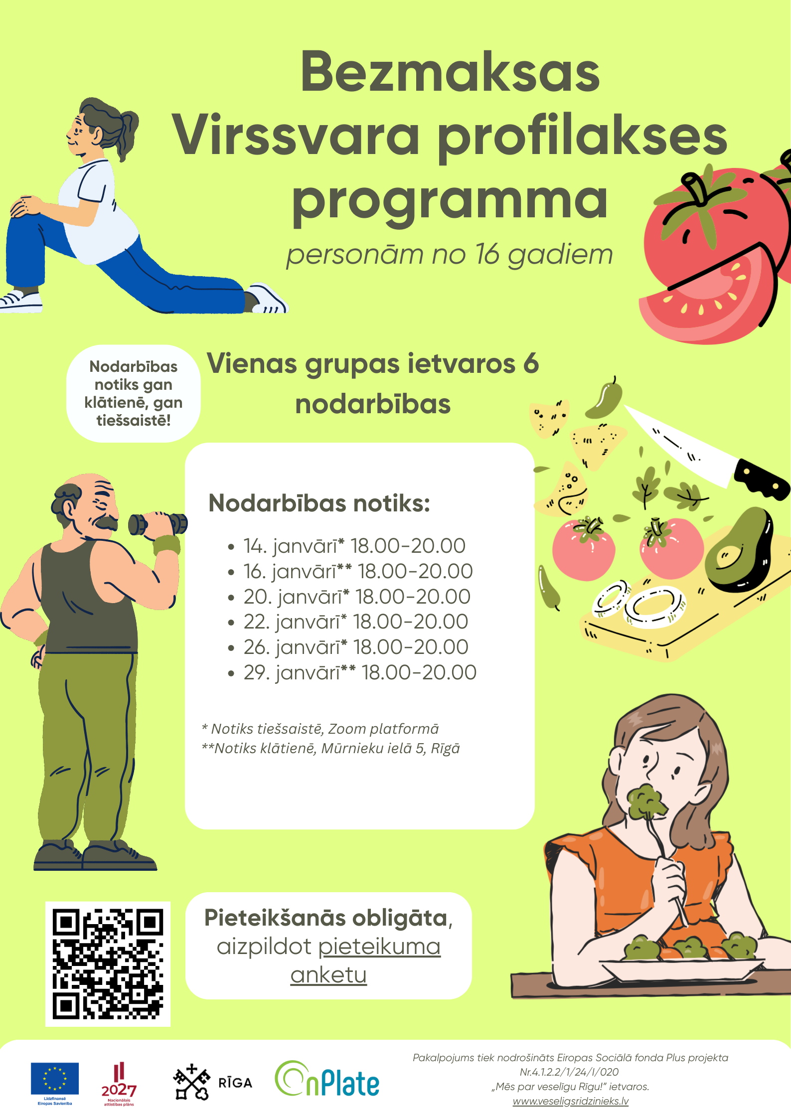 Rīgas valstspilsētas pašvaldības Labklājības departaments sadarbībā ar SIA “OnPlate” aicina Rīgas iedzīvotājus uz bezmaksas nodarbībām “Virssvara profilakses programma personām no 16 gadiem“.