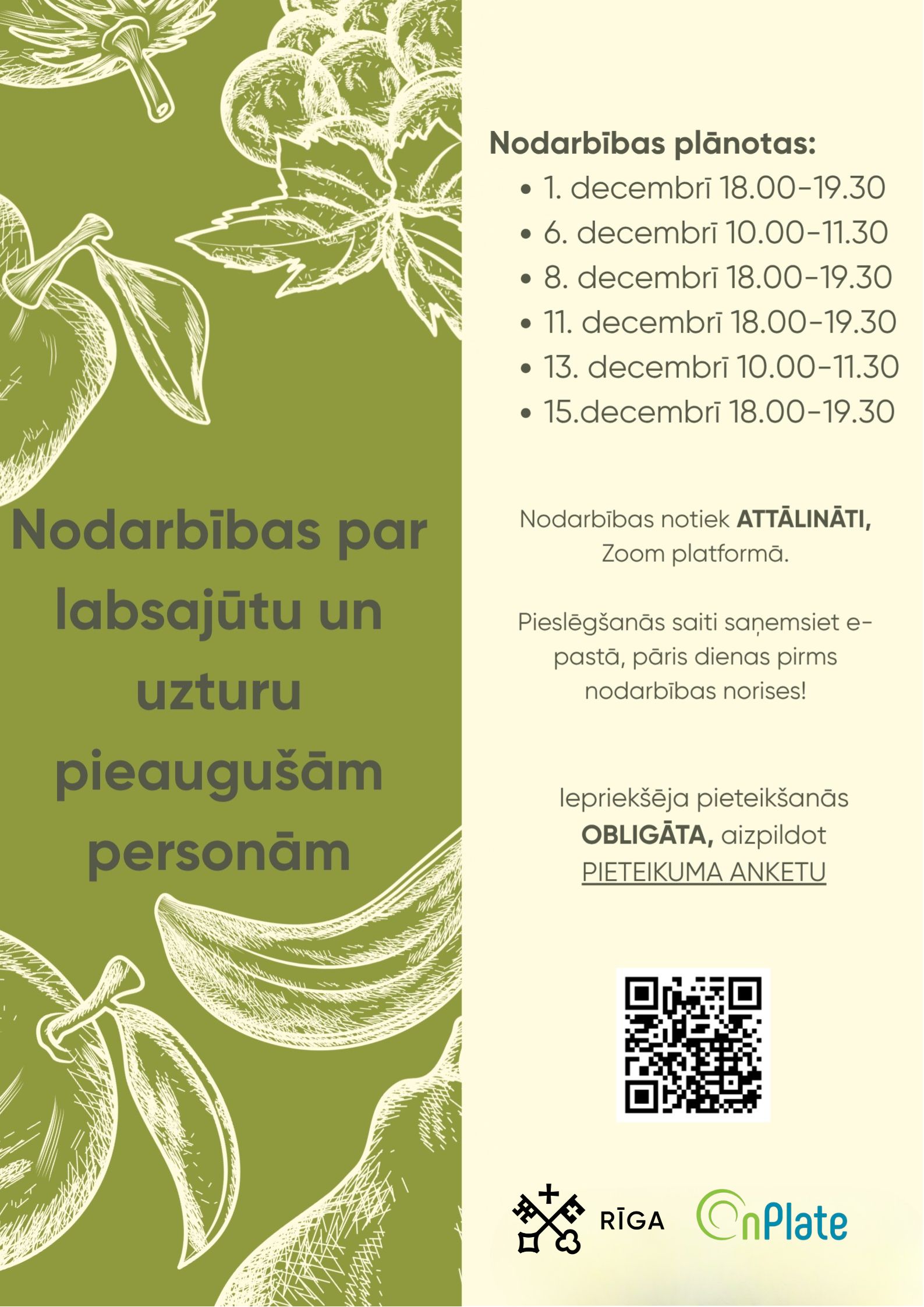 Rīgas valstspilsētas pašvaldības (RVP) Labklājības departaments sadarbībā ar SIA OnPlate aicina piedalīties bezmaksas nodarbībās par labsajūtu un uzturu pieaugušām personām.