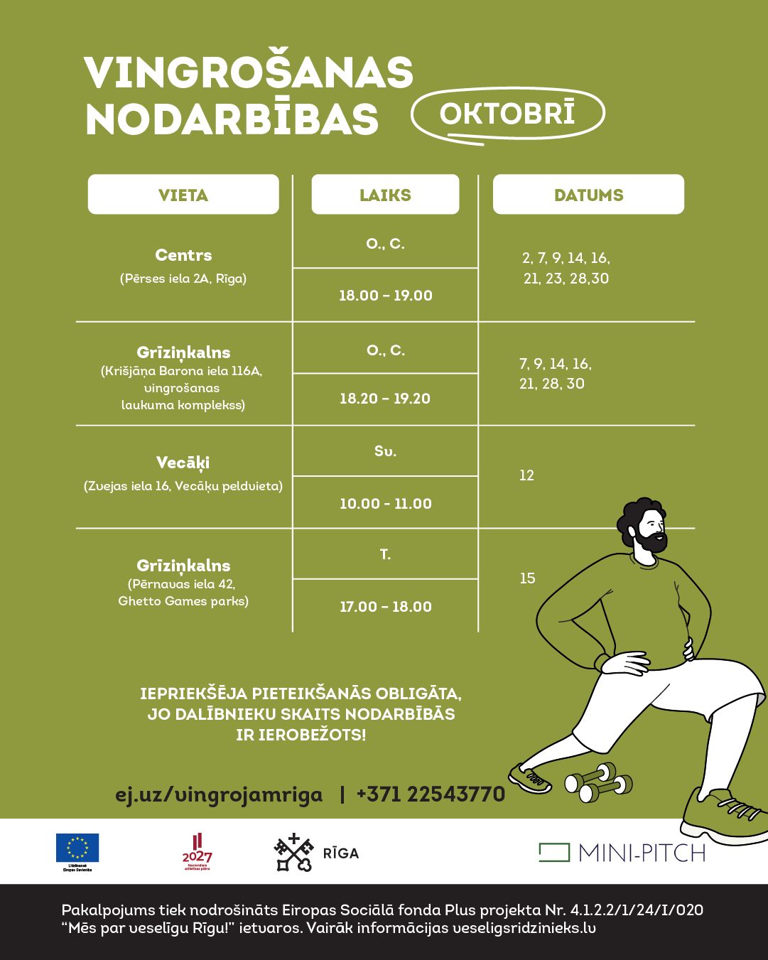 Rīgas valstspilsētas pašvaldības (RVP) Labklājības departaments sadarbībā ar Biedrību “Mini-Pitch” aicina rīdziniekus pievienoties bezmaksas vingrošanas nodarbībām dažādās Rīgas apkaimēs!