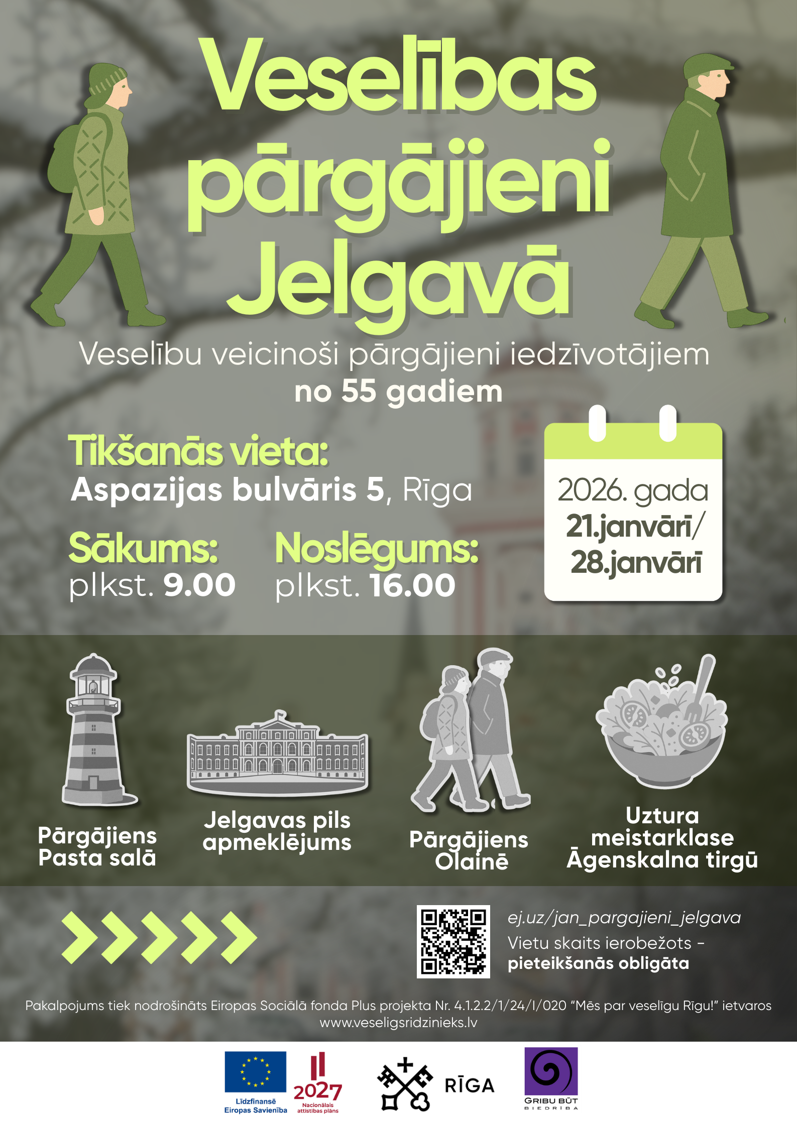 Rīgas valstspilsētas pašvaldības Labklājības departaments sadarbībā ar “GRIBU BŪT” Dzīves kvalitātes uzlabošanas un veselības veicināšanas biedrību aicina iedzīvotājus piedalīties bezmaksas veselību veicinošos pārgājienos iedzīvotājiem no 55 gadiem, būt aktīviem, iesaistīties fizisko aktivitāšu, veselīga uztura un psihoemocionālas veselības veicināšanas praktiskajās nodarbībās, veicinot socializēšanos un apgūstot jaunas veselību veicinošas prasmes īpaši šai vecuma grupai raksturīgo veselības riska faktoru mazināšanai un attālināšanai.