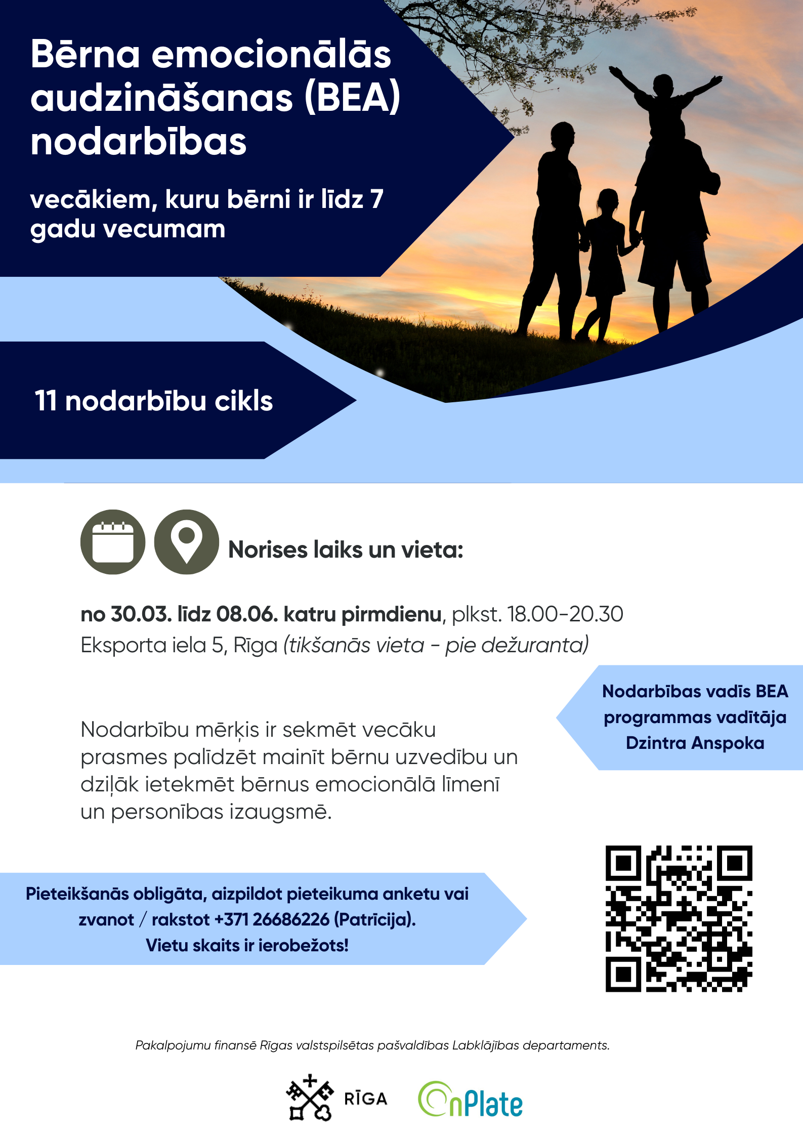Rīgas valstspilsētas pašvaldības Labklājības departaments sadarbībā ar SIA “OnPlate” aicina pieteikties bezmaksas nodarbību ciklam vecākiem ar mērķi pilnveidot zināšanas un prasmes par bērnu agrīno psihoemocionālo attīstību un drošas vides veidošanas veicināšanu bērna attīstībai.