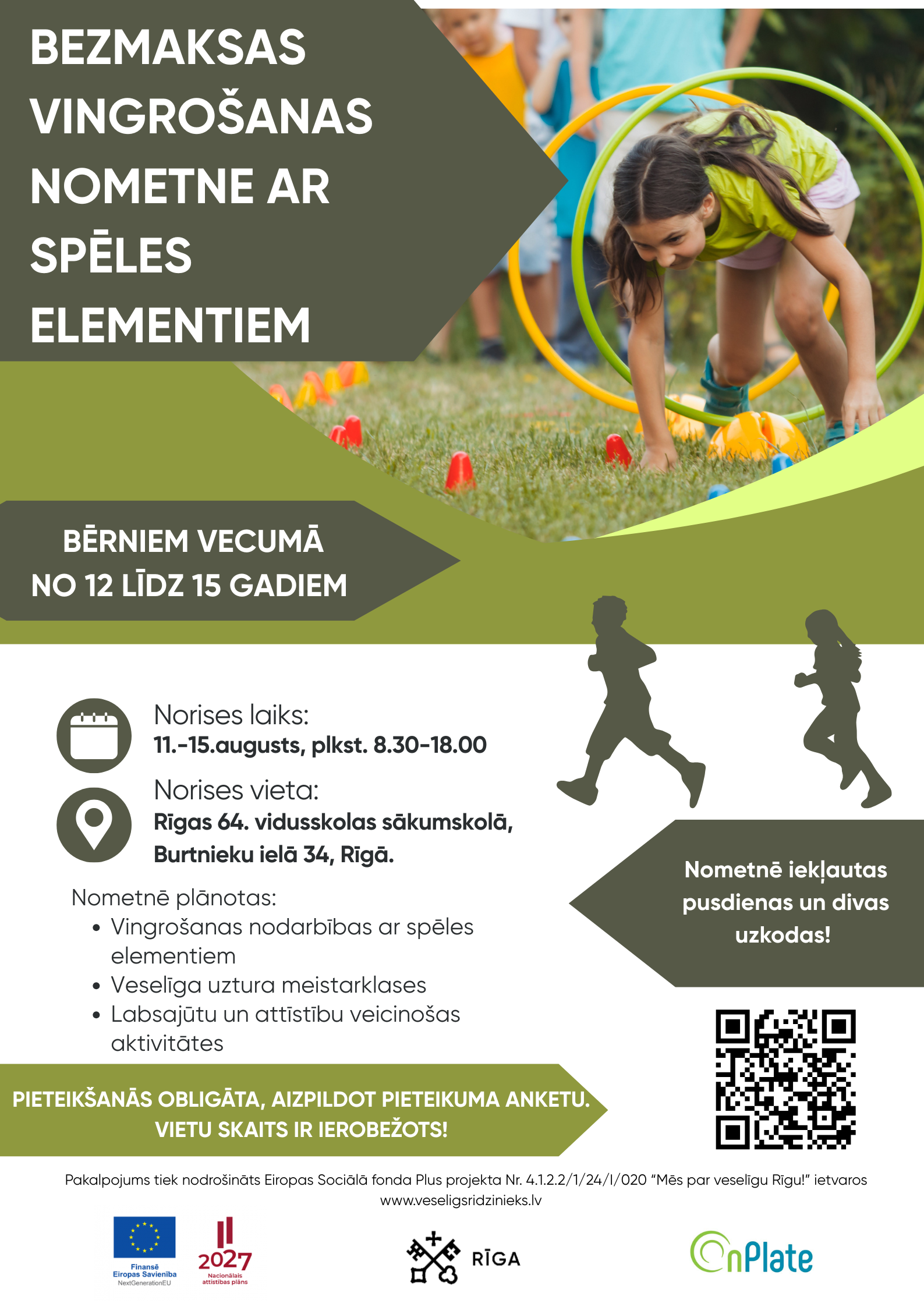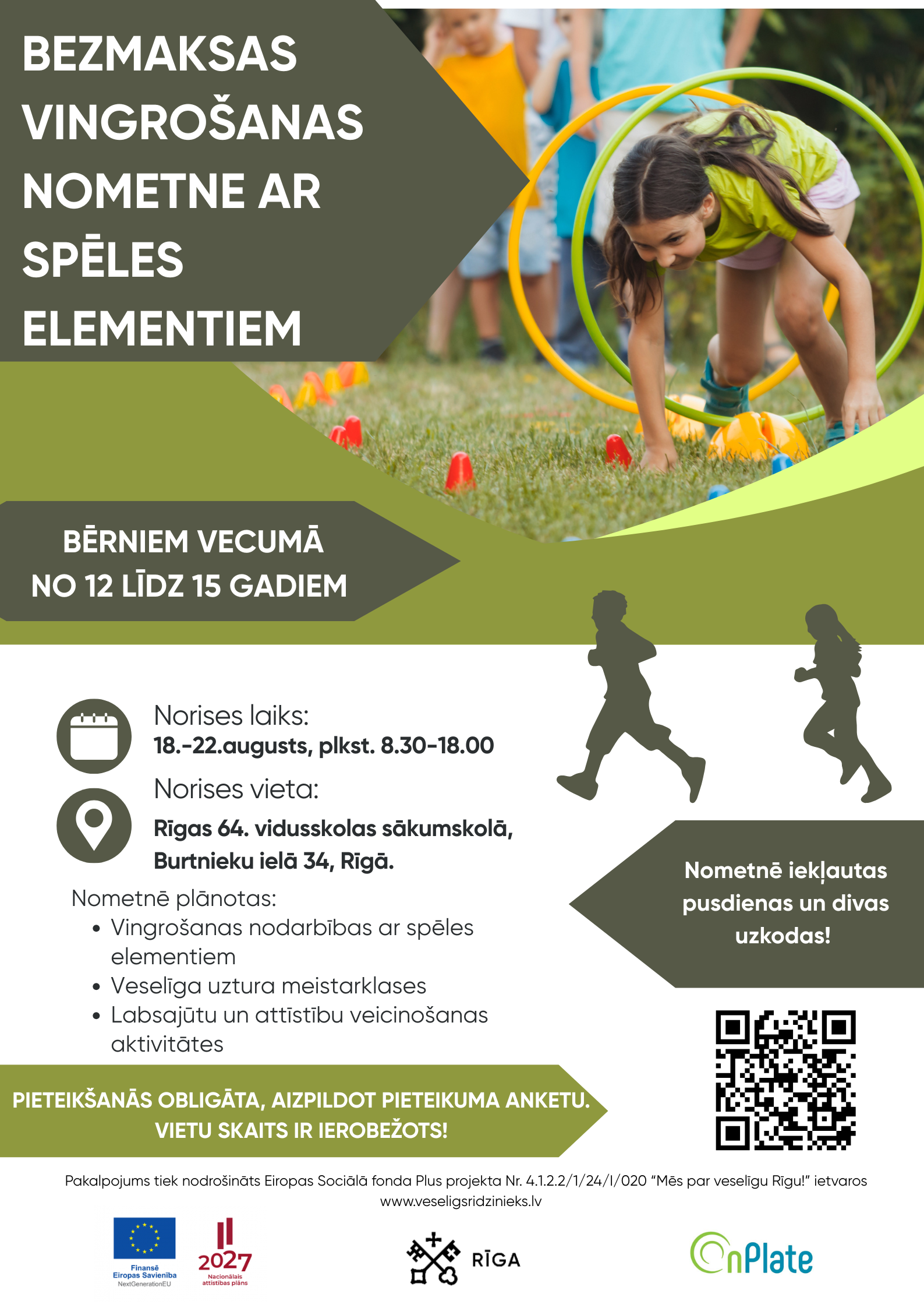 Rīgas valstpilsētas pašvaldības Labklājības departaments sadarbībā ar SIA “OnPlate” aicina bērnus vecumā no 12 līdz 15 gadiem piedalīties dienas nometnēs ar vingrošanas un spēļu elementiem Rīgas 64.vidusskolas sākumskolas telpās un sporta laukumā (Burtnieku ielā 34, Rīgā).