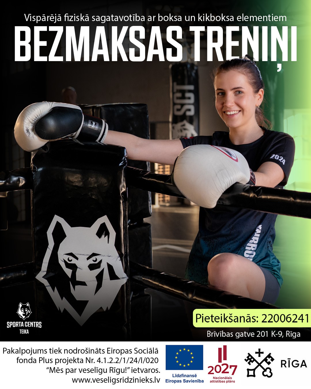 Rīgas valstspilsētas pašvaldības Labklājības departaments sadarbībā ar Sporta centrs Teika Daugavas labajā krastā piedāvā fiziskās sagatavotības nodarbības ar boksa/kikboksa elementiem.