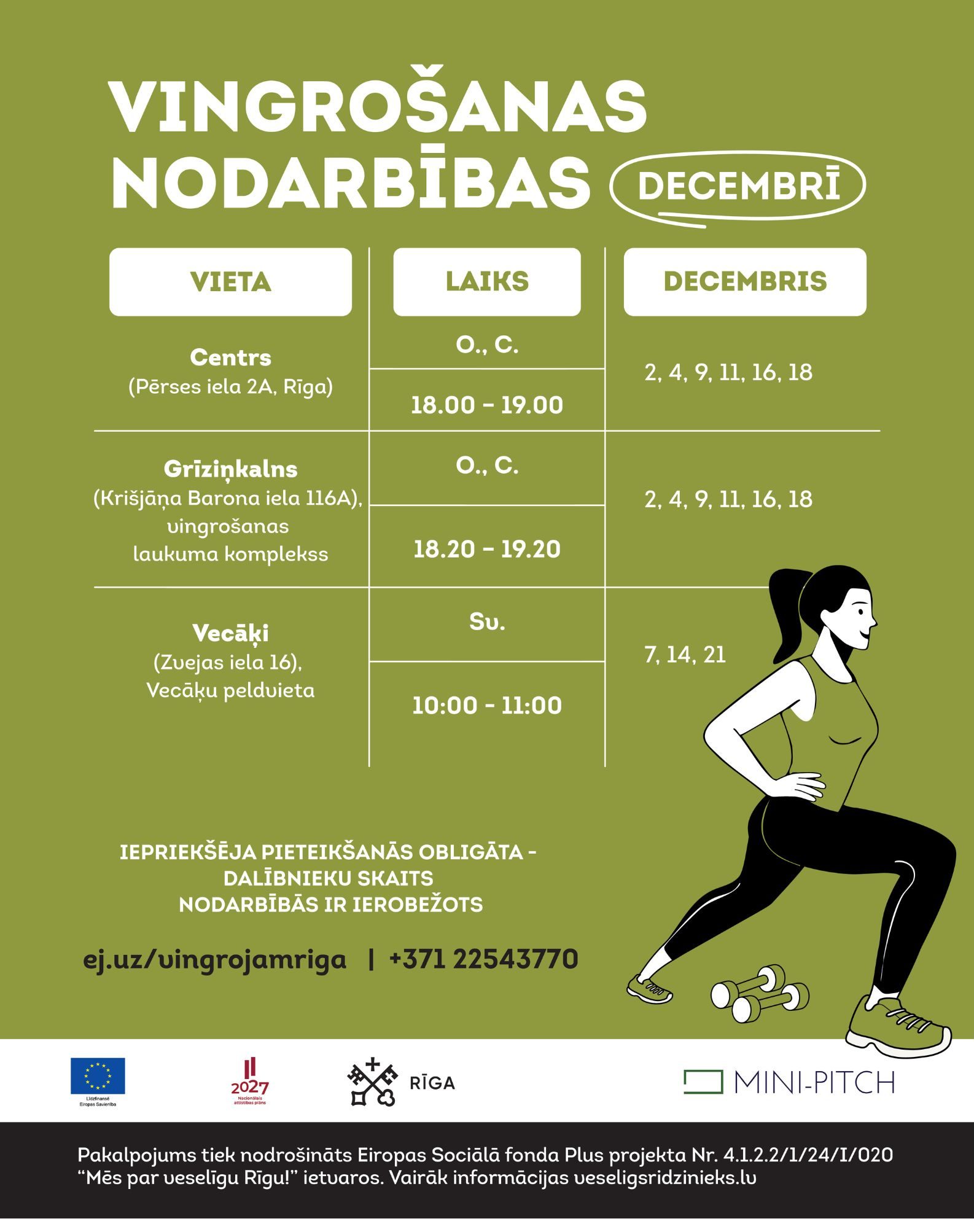Dalībnieku skaits nodarbībās ir ierobežots un iepriekšēja pieteikanās ir obligāta: ej.uz/vingrojamriga vai zvani +371 22543770.