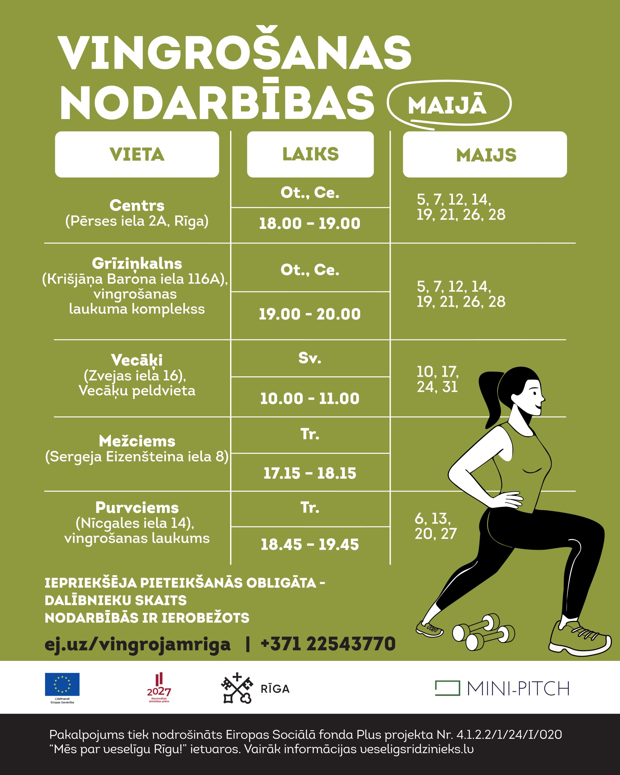 Rīgas valstspilsētas pašvaldības (RVP) Labklājības departaments sadarbībā ar biedrību “Mini-Pitch” aicina rīdziniekus pievienoties bezmaksas vingrošanas nodarbībām!