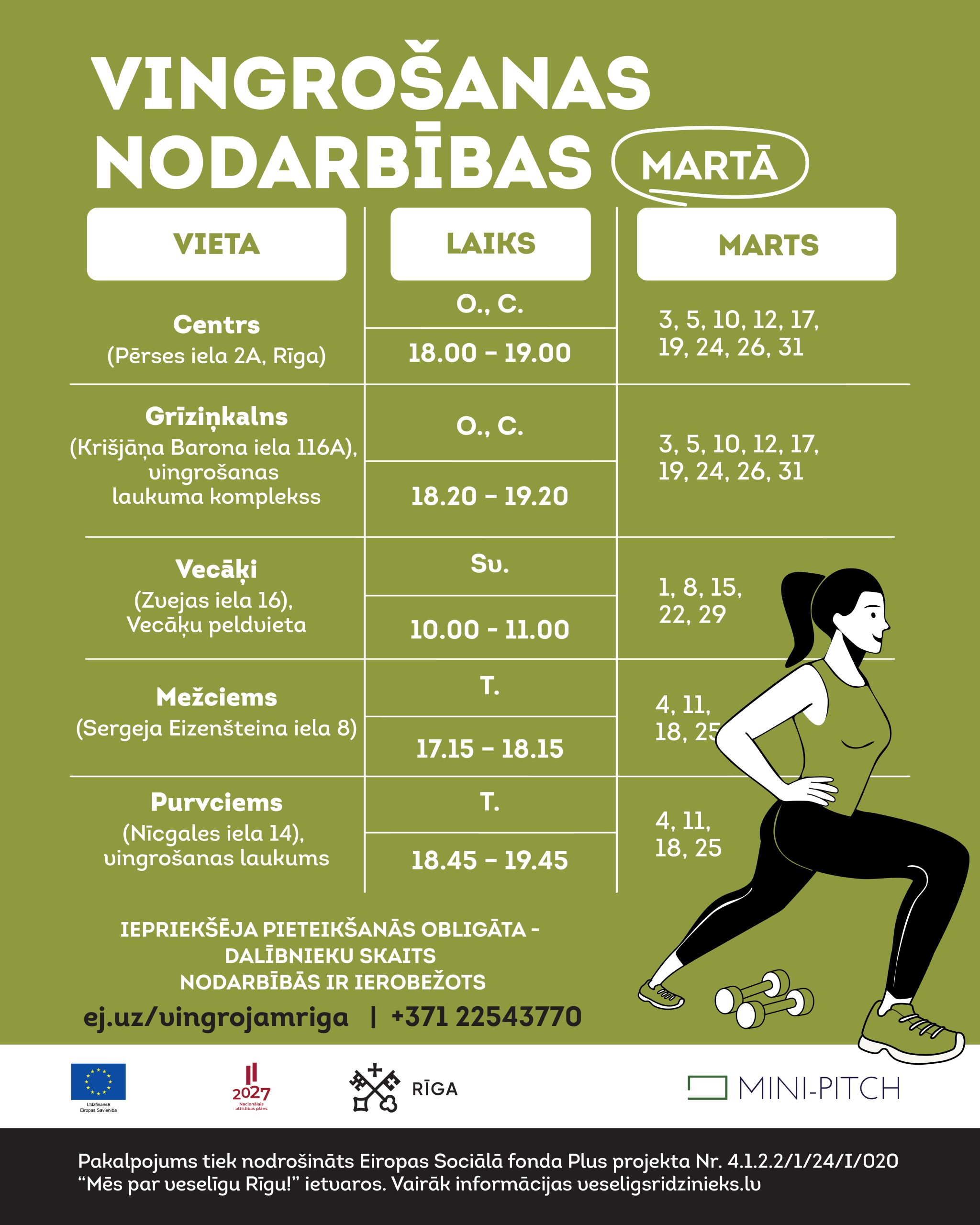 Dalībnieku skaits nodarbībās ir ierobežots un iepriekšēja pieteikanās ir obligāta: ej.uz/vingrojamriga vai zvani +371 22543770.