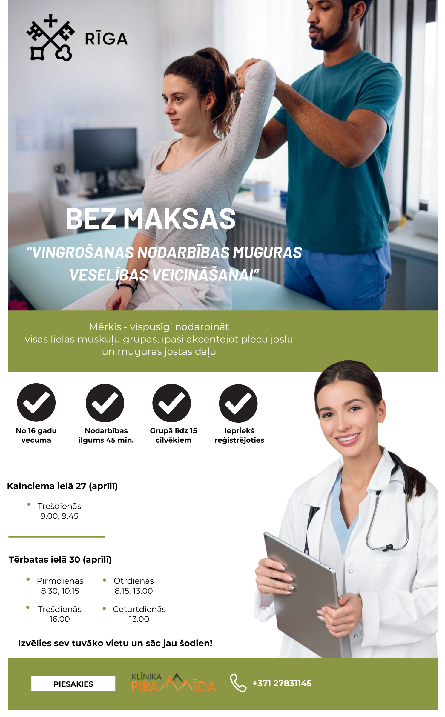 Vingrošana notiek nelielās grupās fizioterapeita vadībā, kas nodrošina pareizu vingrojumu izpildi un sniedz praktisku informāciju par fizisko aktivitāšu nozīmi, drošu tehniku un vecumam atbilstošu slodzi. Regulāra vingrošana fizioterapeita vadībā palīdz stiprināt muguras muskulatūru, uzlabot stāju un mazināt sēdoša dzīvesveida negatīvo ietekmi. Jo laicīgāk muguras veselībai tiek pievērsta uzmanība, jo efektīvāk var novērst veselības problēmu saasināšanos nākotnē.