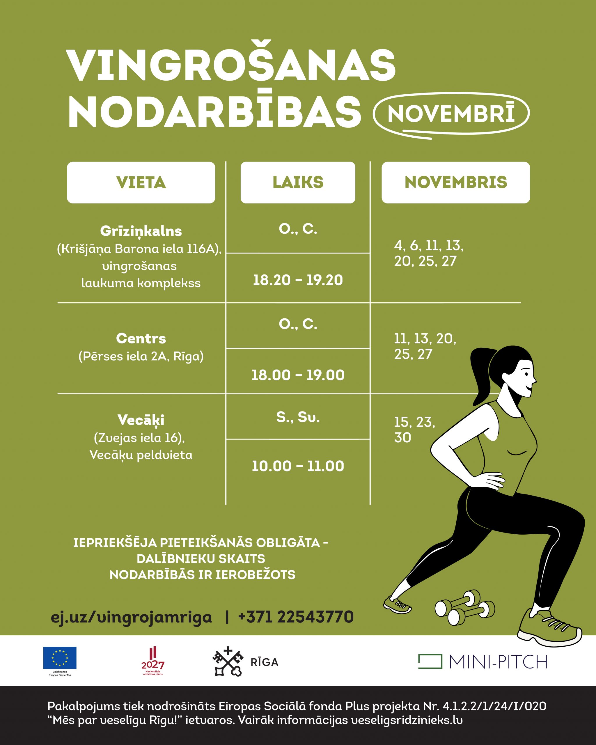 Dalībnieku skaits nodarbībās ir ierobežots un iepriekšēja pieteikanās ir obligāta: ej.uz/vingrojamriga vai zvani +371 22543770.