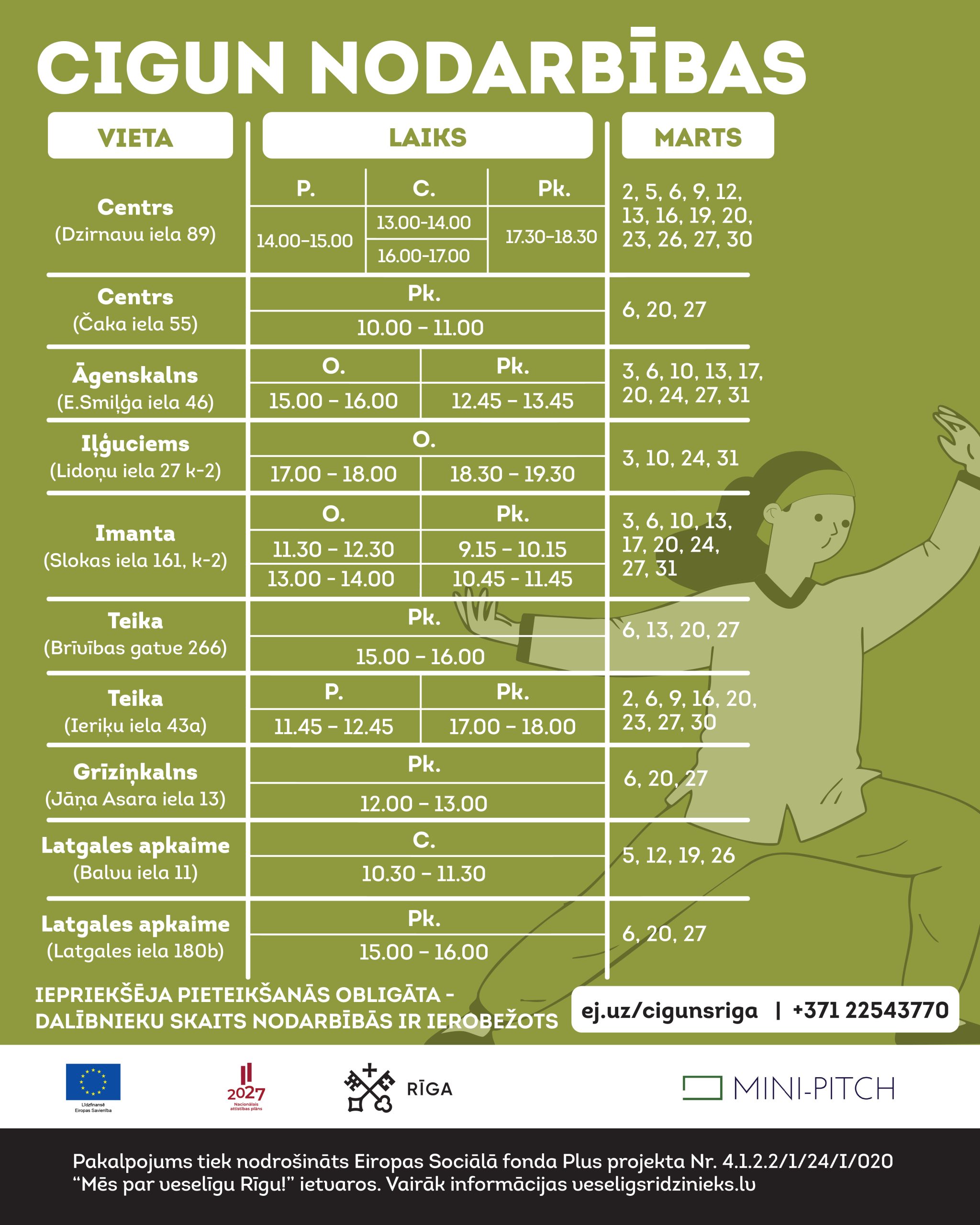 Rīgas valstspilsētas pašvaldības Labklājības departaments sadarbībā ar Biedrību “Mini-Pitch” aicina Rīgas iedzīvotājus pievienoties bezmaksas cigun nodarbībām dažādās Rīgas apkaimēs.