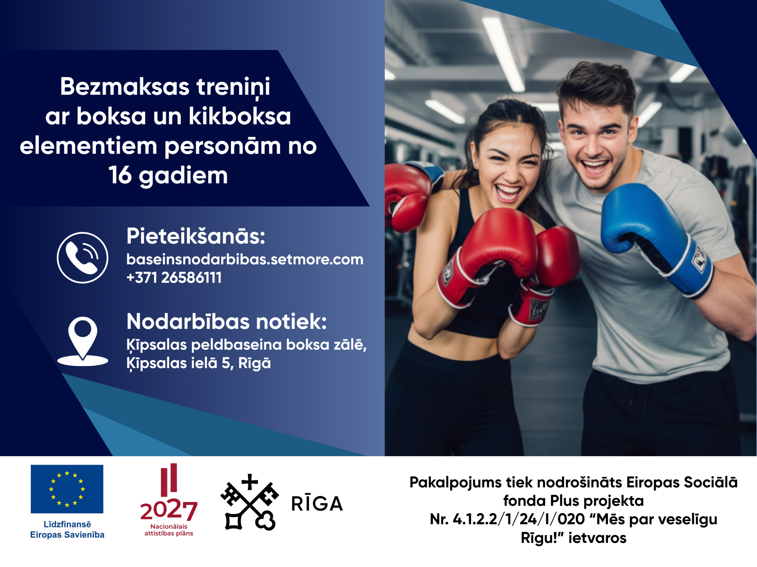 Sākot ar š.g. februāri iedzīvotājiem Eiropas Sociālā fonda Plus projekta Nr. 4.1.2.2/1/24/I/020 “Mēs par veselīgu Rīgu!” ietvaros sadarbībā ar SIA “Ķīpsalas peldbaseins” Daugavas kreisajā krastā būs pieejams jauns pakalpojums fiziskās sagatavotības nodarbības ar boksa/kikboksa elementiem.