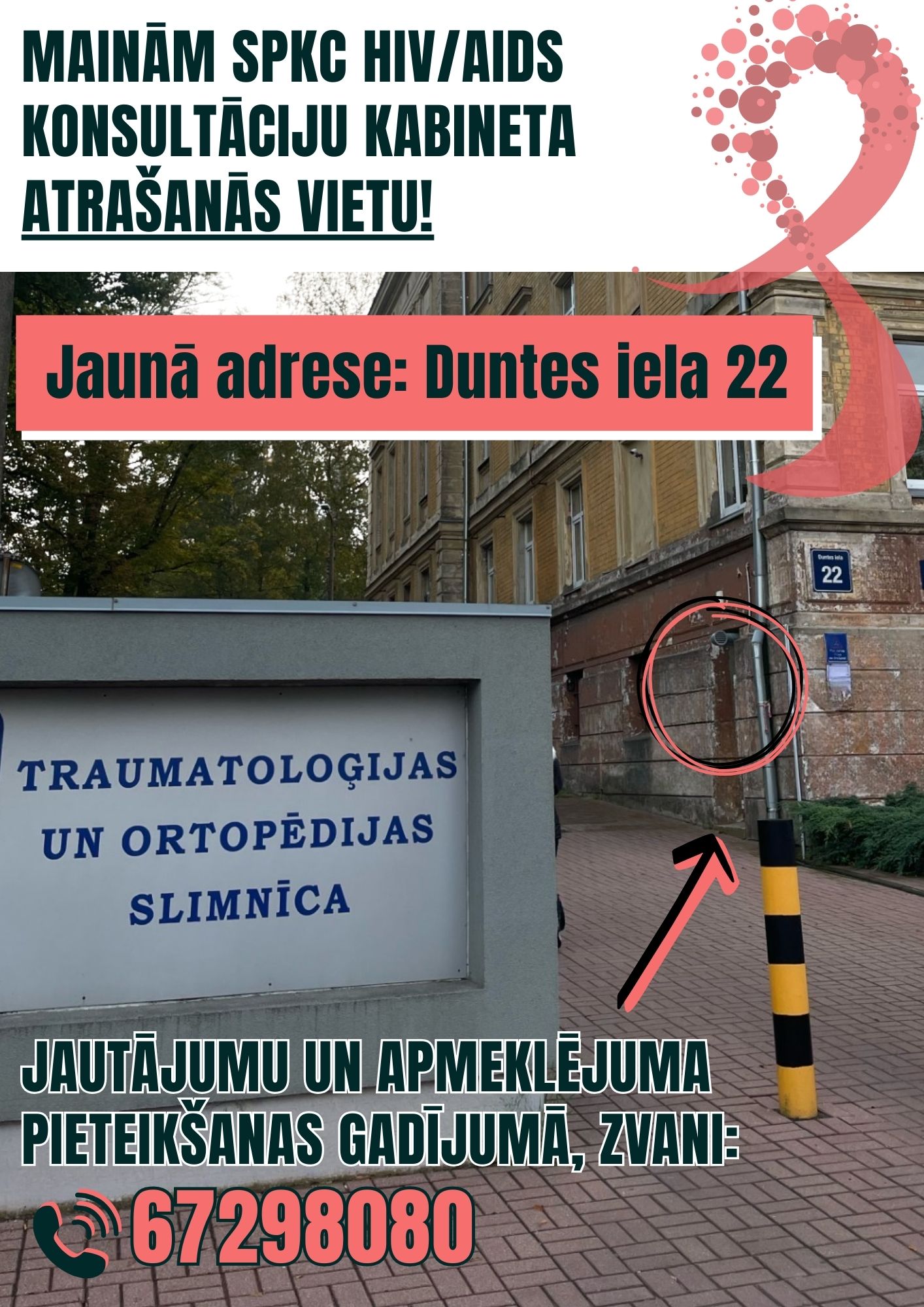 SPKC informē, ka kopš 20. novembra, SPKC HIV/AIDS konsultāciju kabinets pieņem apmeklētājus jaunās telpās – Duntes ielā 22, Rīgā (iepriekšējā adrese: Klijānu iela 7) nodrošinot ērtāku piekļuvi iedzīvotājiem!