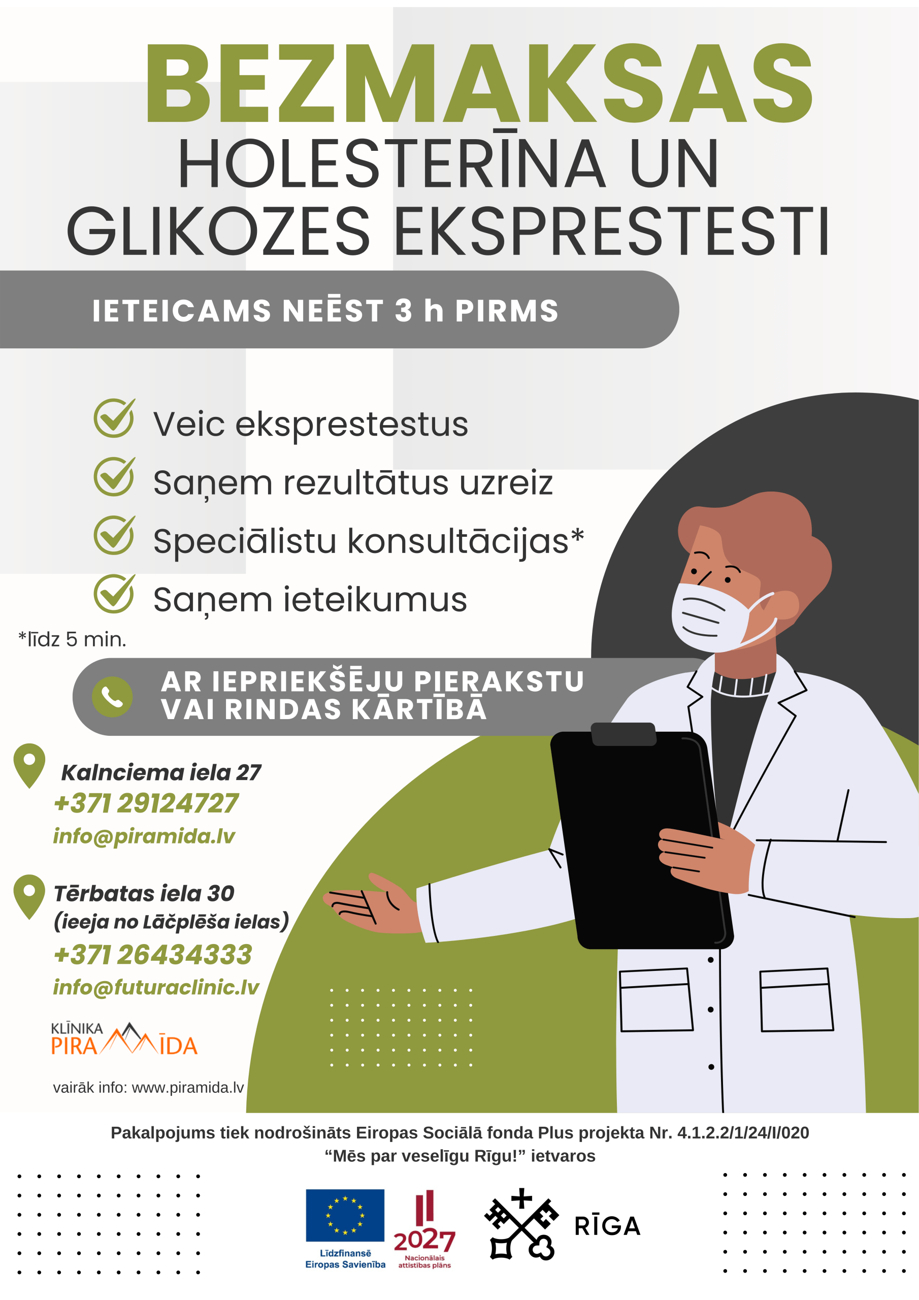 Rīgas valstspilsētas pašvaldības Labklājības departaments sadarbībā ar SIA “Klīnika Piramīda 3” aicina Rīgas iedzīvotājus bezmaksas noteikt holesterīna un glikozes līmeni asinīs ar eksprestestu palīdzību, kā arī saņemt speciālista ekspreskonsultāciju.