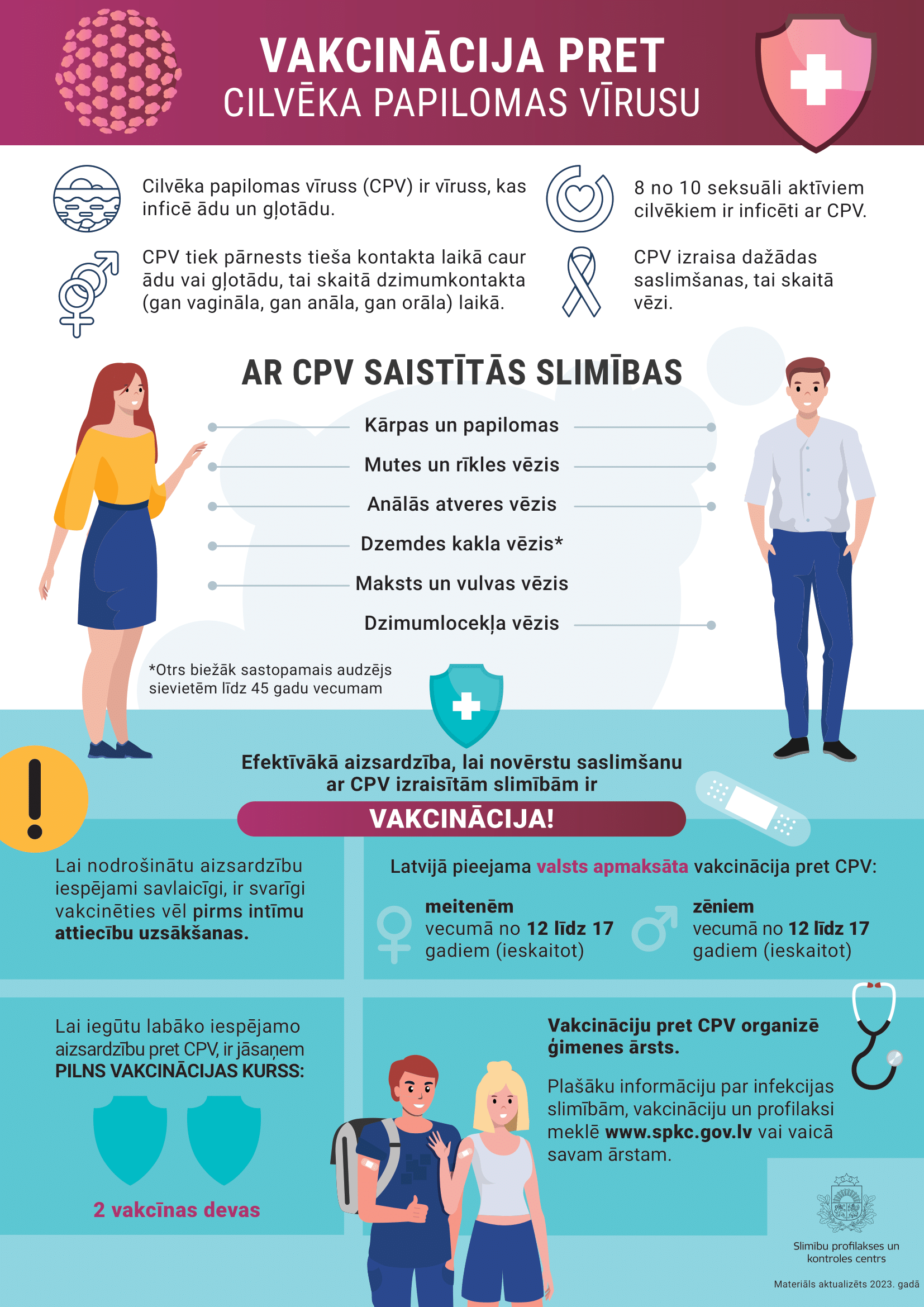 Ik gadu Latvijā dzemdes kakla vēzi diagnosticē aptuveni 240 sievietēm, un tā ir viena no biežākajām ļaundabīgajām slimībām sievietēm līdz 45 gadu vecumam. Latvijā katru gadu ar šo slimību mirst 110 sievietes [1]. Ir skaidri izpētīts dzemdes kakla vēža iemesls – 99 % gadījumu to rada ilgstoša cilvēka papilomas vīrusa (turpmāk tekstā CPV) infekcija, ar kuru var inficēties tieša kontakta laikā caur ādu vai gļotādu, tai skaitā dzimumkontakta laikā.