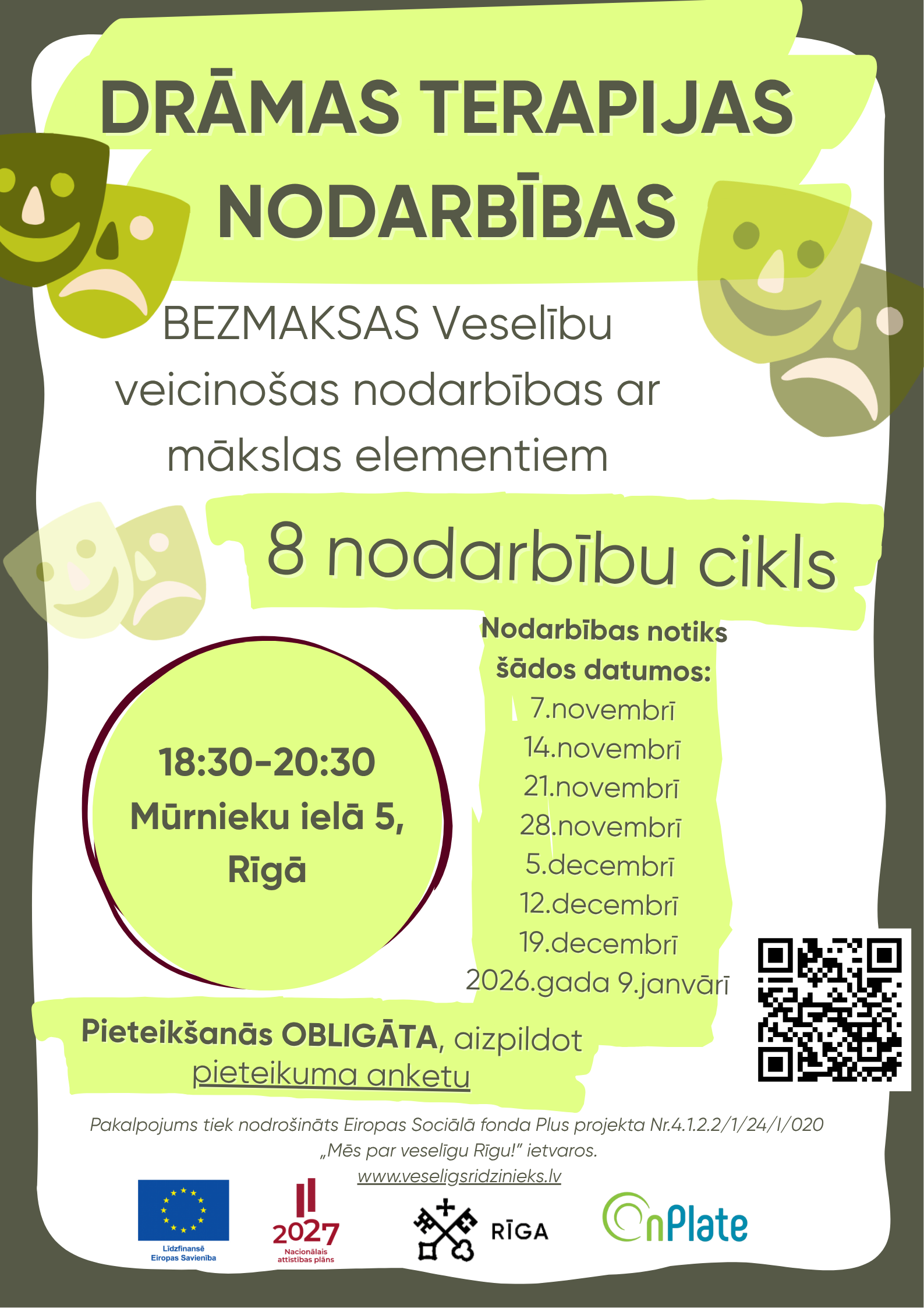 Rīgas valstpilsētas pašvaldības Labklājības departaments sadarbībā ar SIA “OnPlate” aicina Rīgas iedzīvotājus pieteikties bezmaksas veselību veicinošām nodarbībām ar drāmas terapijas elementiem.