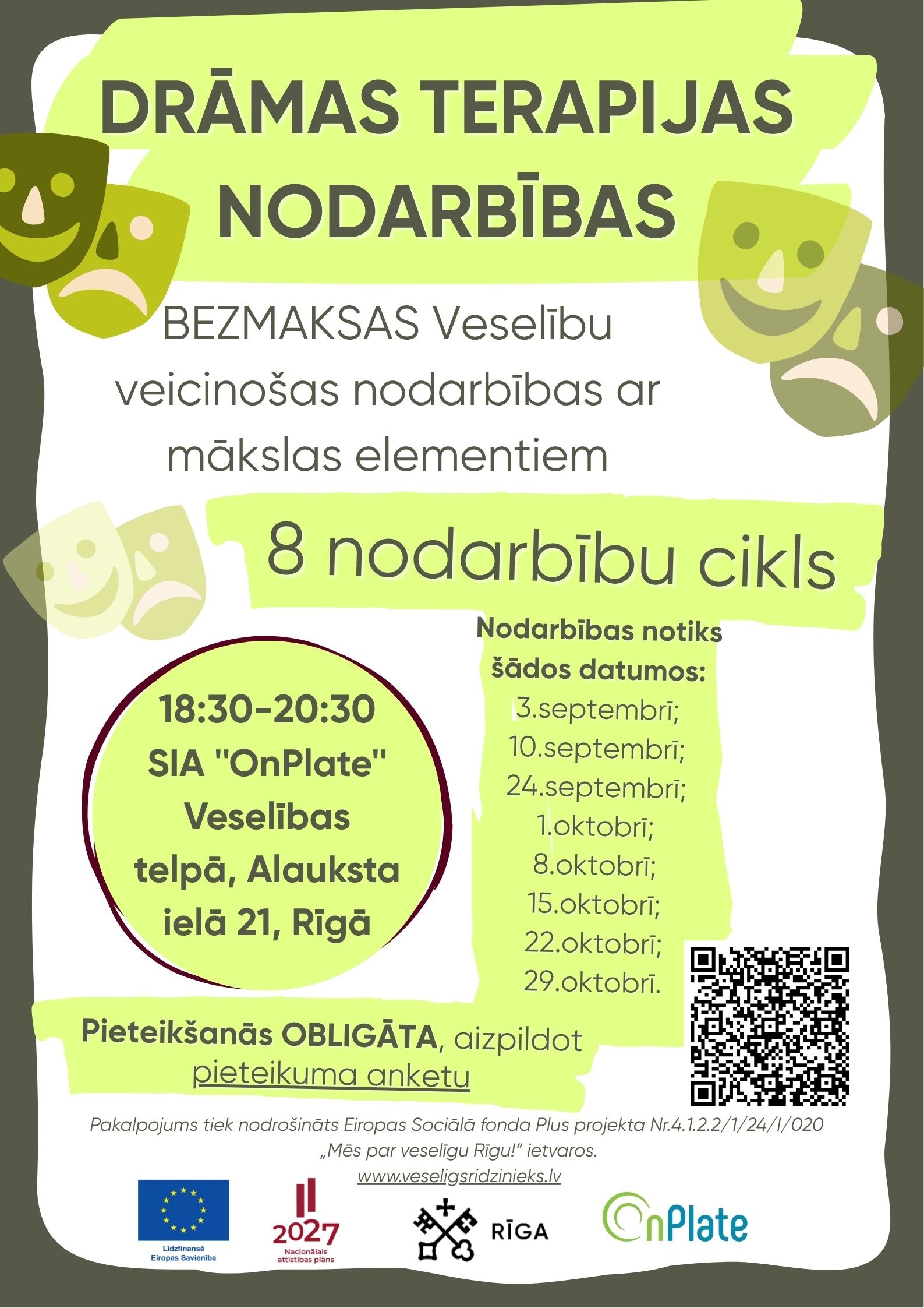 Rīgas valstpilsētas pašvaldības Labklājības departaments sadarbībā ar SIA “OnPlate” aicina Rīgas iedzīvotājus pieteikties bezmaksas veselību veicinošām nodarbībām ar drāmas terapijas elementiem.