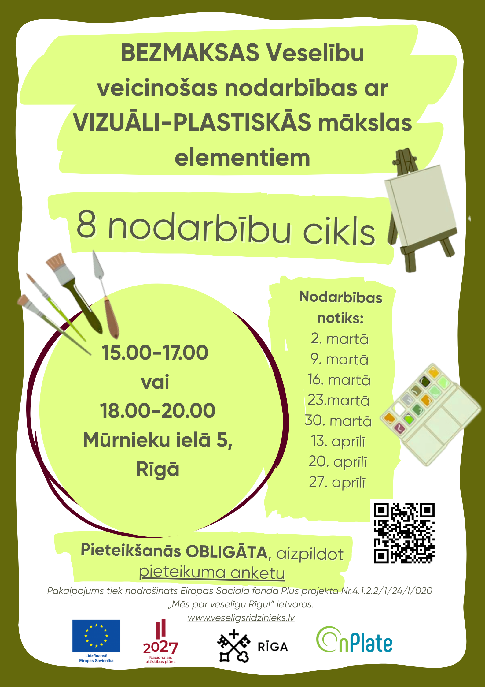 Rīgas valstspilsētas pašvaldības Labklājības departaments sadarbībā ar SIA “OnPlate” aicina Rīgas iedzīvotājus uz bezmaksas nodarbību cikliem ar vizuāli – plastiskās mākslas elementiem.