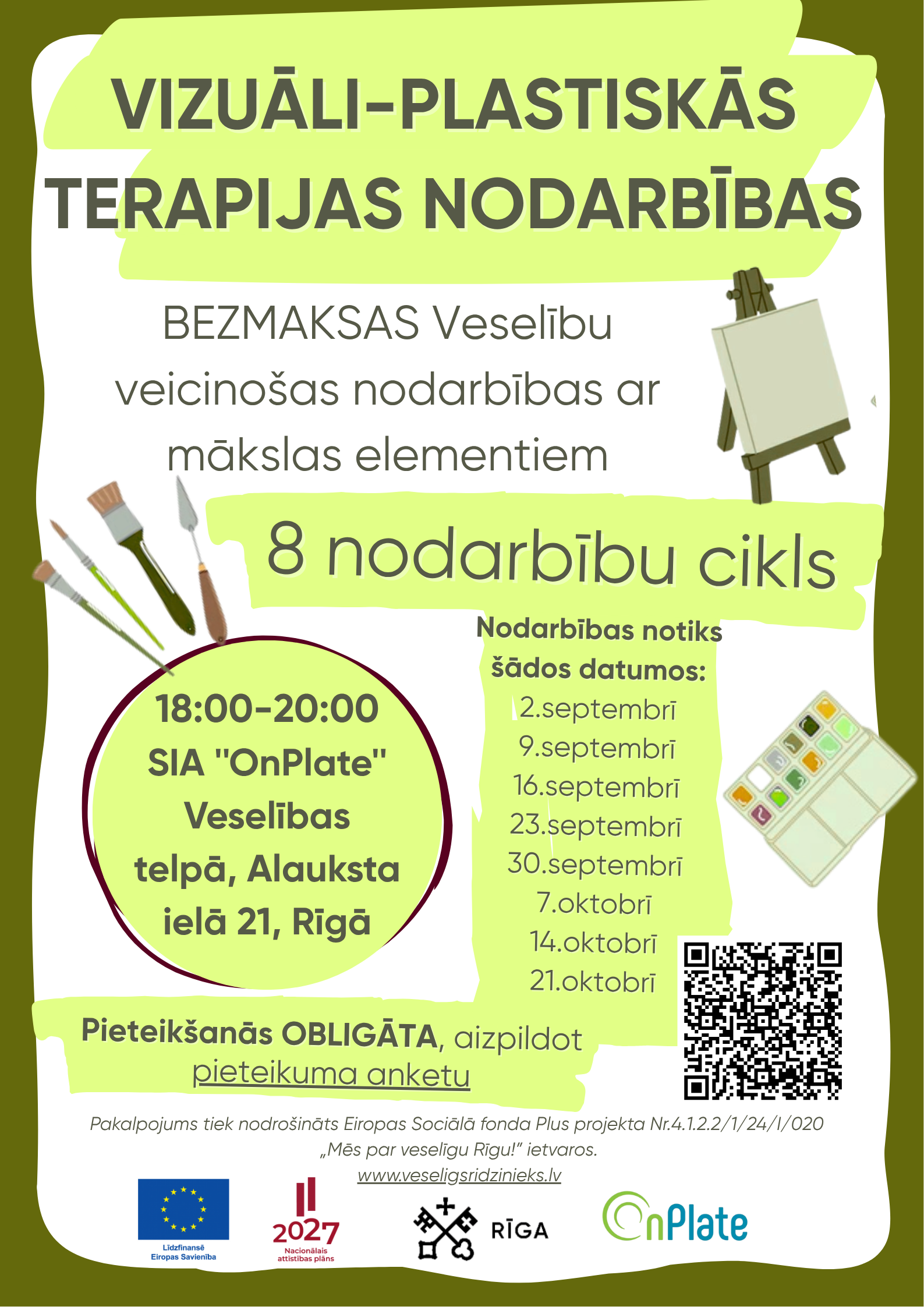 Rīgas valstpilsētas pašvaldības Labklājības departaments sadarbībā ar SIA “OnPlate” aicina Rīgas iedzīvotājus pieteikties bezmaksas veselību veicinošām nodarbībām ar vizuāli plastiskās terapijas elementiem.