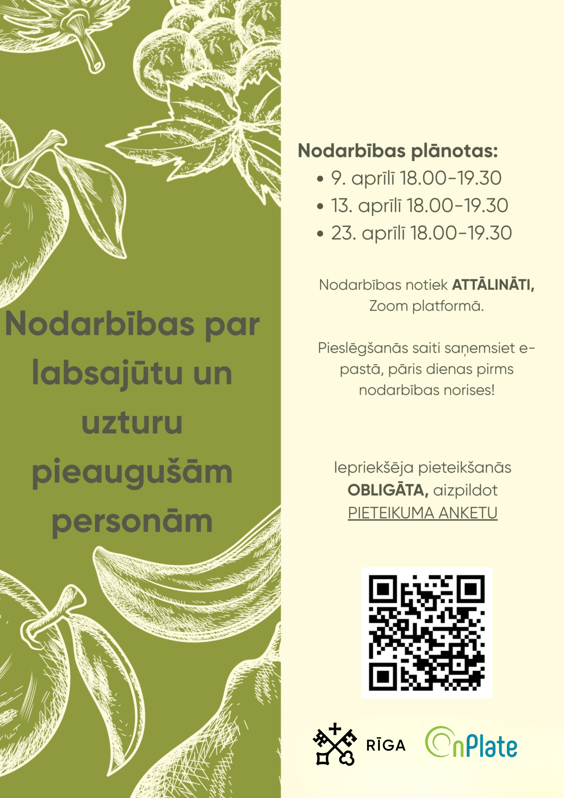 Rīgas valstspilsētas pašvaldības (RVP) Labklājības departaments sadarbībā ar SIA “OnPlate” aicina piedalīties bezmaksas nodarbībās par labsajūtu un uzturu pieaugušām personām.