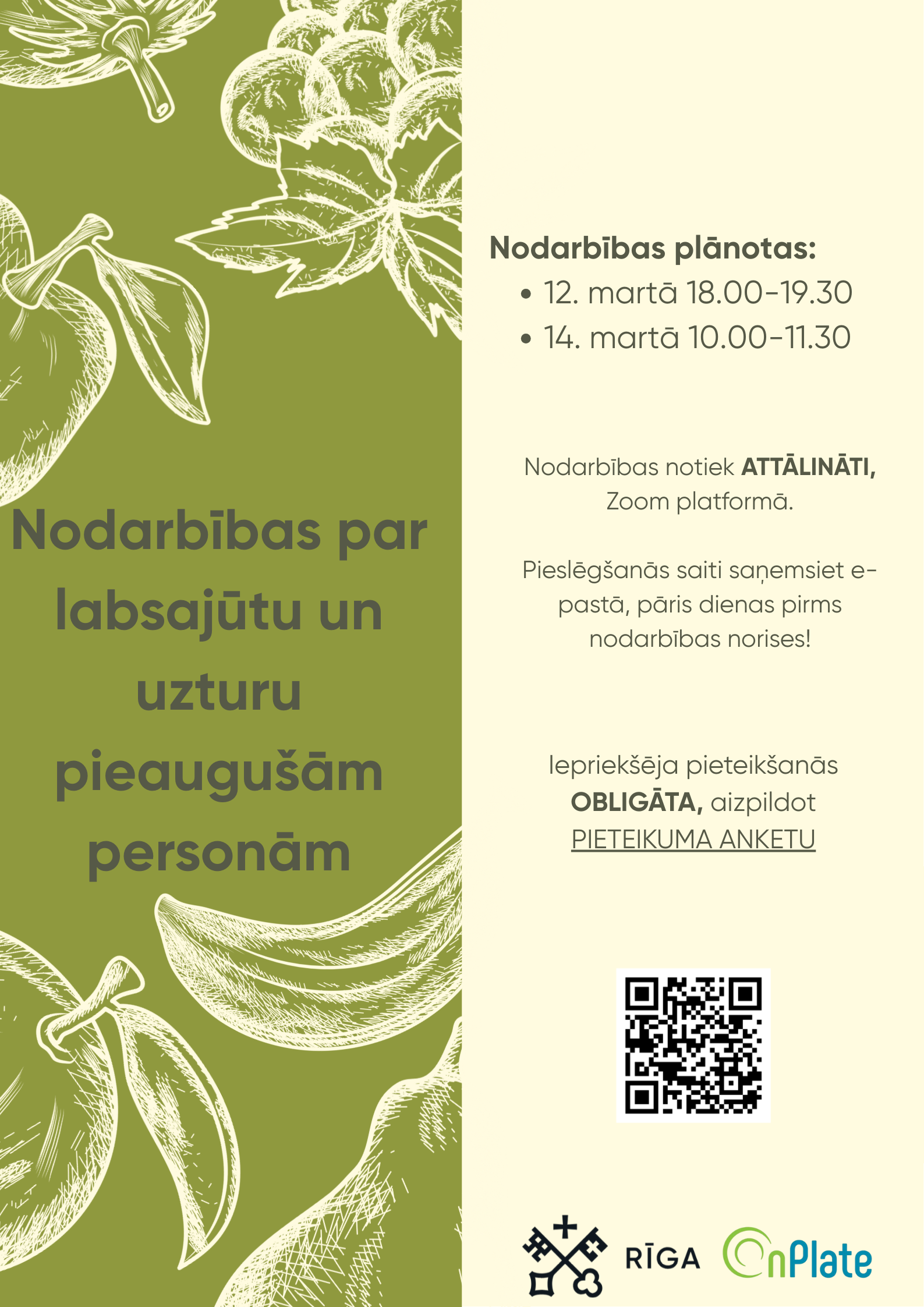 Rīgas valstspilsētas pašvaldības (RVP) Labklājības departaments sadarbībā ar SIA “OnPlate” aicina piedalīties bezmaksas nodarbībās par labsajūtu un uzturu pieaugušām personām.
