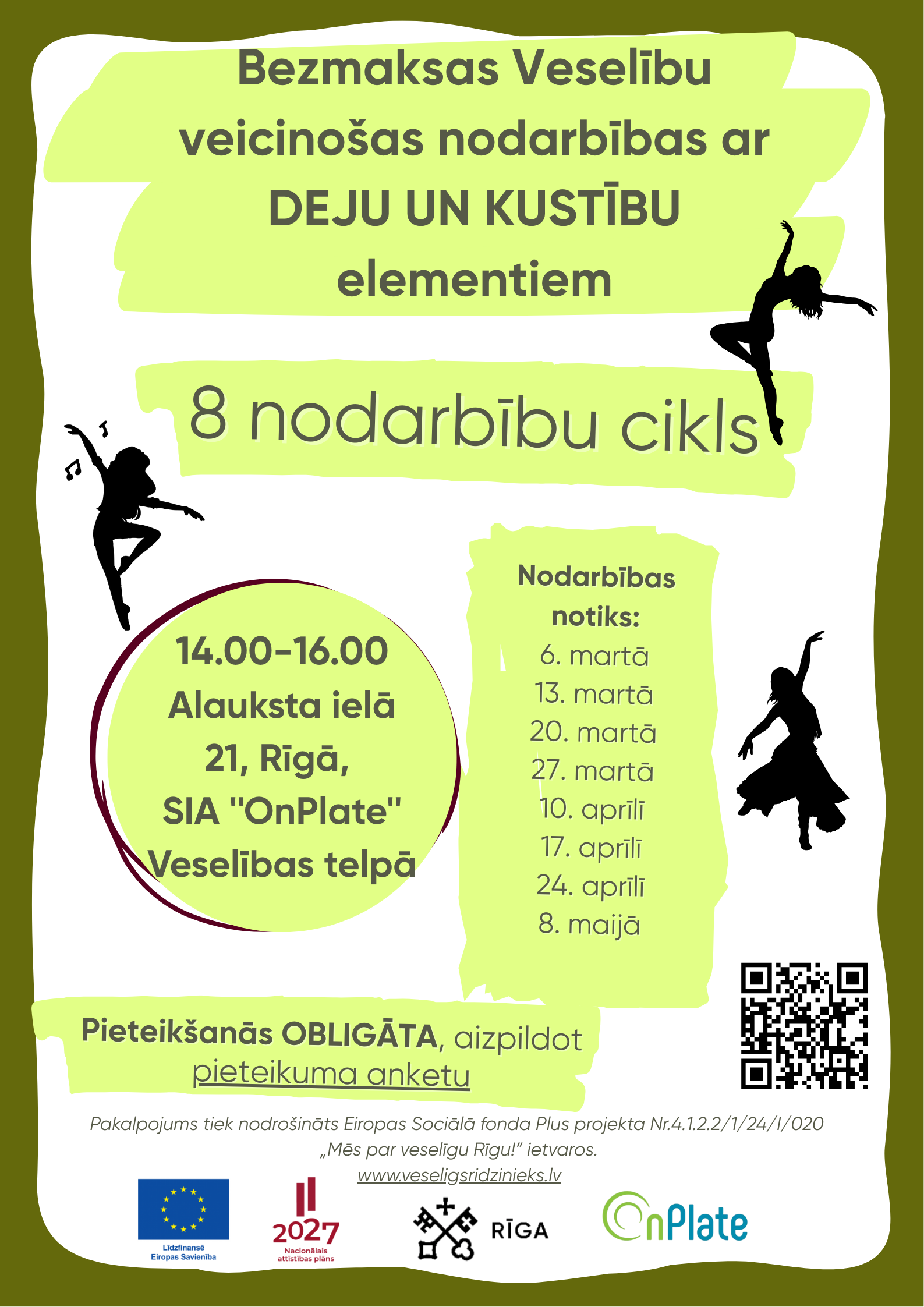 Rīgas valstspilsētas pašvaldības Labklājības departaments sadarbībā ar SIA “OnPlate” aicina Rīgas iedzīvotājus uz bezmaksas nodarbību ciklu ar DEJU UN KUSTĪBU elementiem!