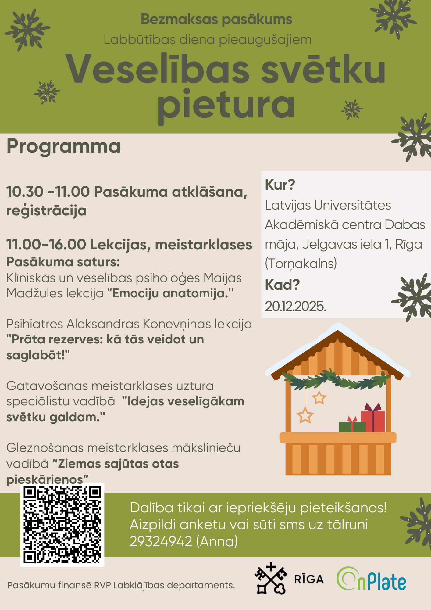 Pasākuma dalībnieki varēs noklausītas psihoemocionālās veselības jomas ekspertu lekcijas un piedalīties meistarklasēs svētku noskaņās, kas iedvesmos svētku prieka radīšanai, veselīgam dzīvesveidam un sniegs mirkli atpūtas pirmssvētku dinamiskajā ikdienā.