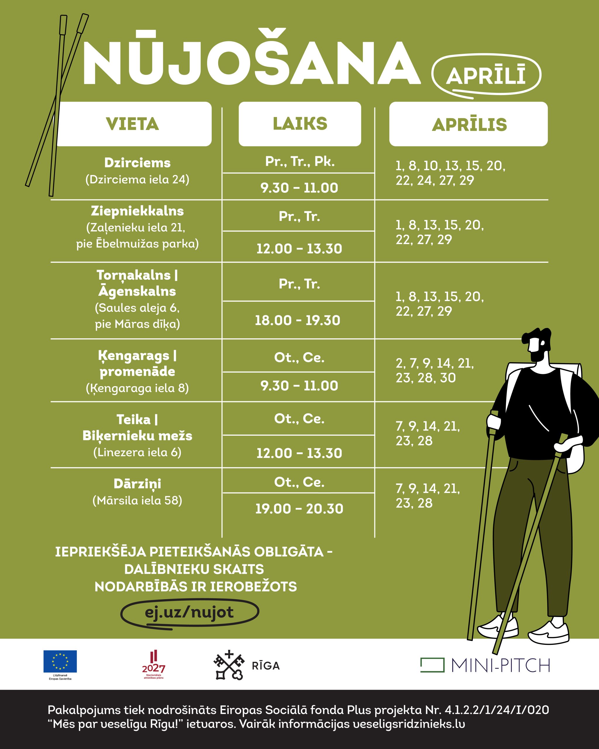 Rīgas valstspilsētas pašvaldības Labklājības departaments sadarbībā ar biedrību “Mini-Pitch” turpina iedvesmot rīdziniekus veselīgam dzīvesveidam, aicinot pievienoties bezmaksas nūjošanas nodarbībām dažādās Rīgas apkaimēs.