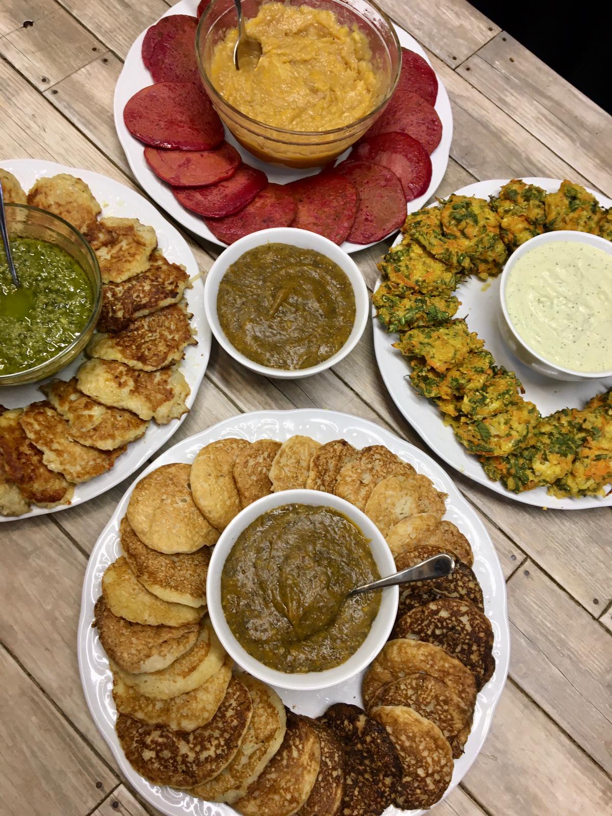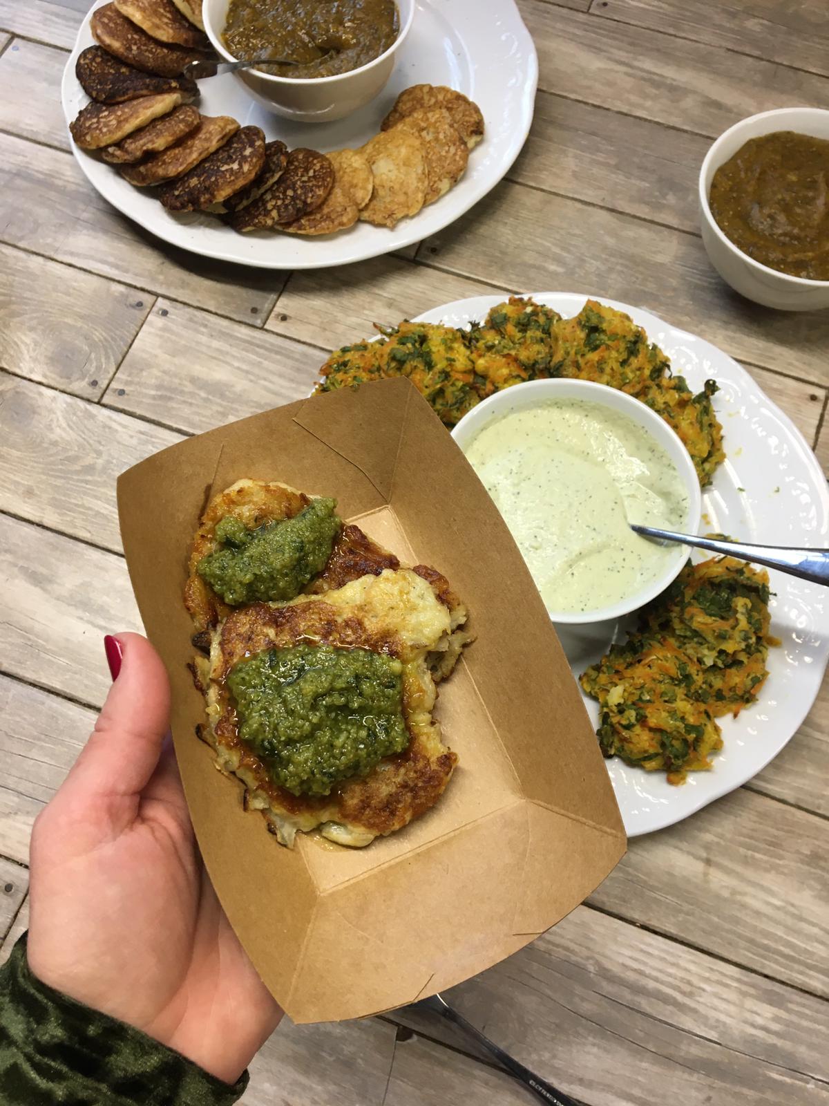 Turku zirņu, dārzeņu pankūkas ar Indijas riekstu-zaļumu krēmu
