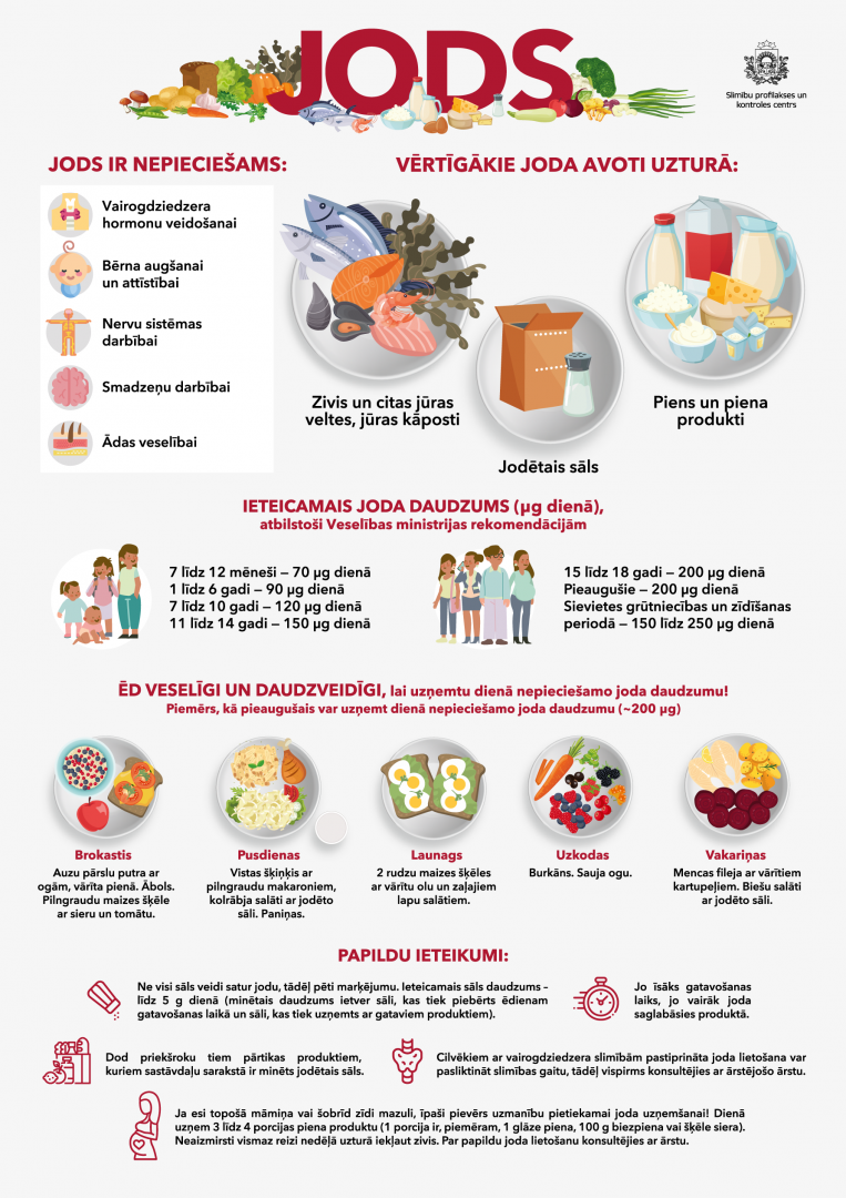 Vairāk par jodu lasi Slimību profilakses un kontroles centra bukletā “Jods tavai veselībai”
