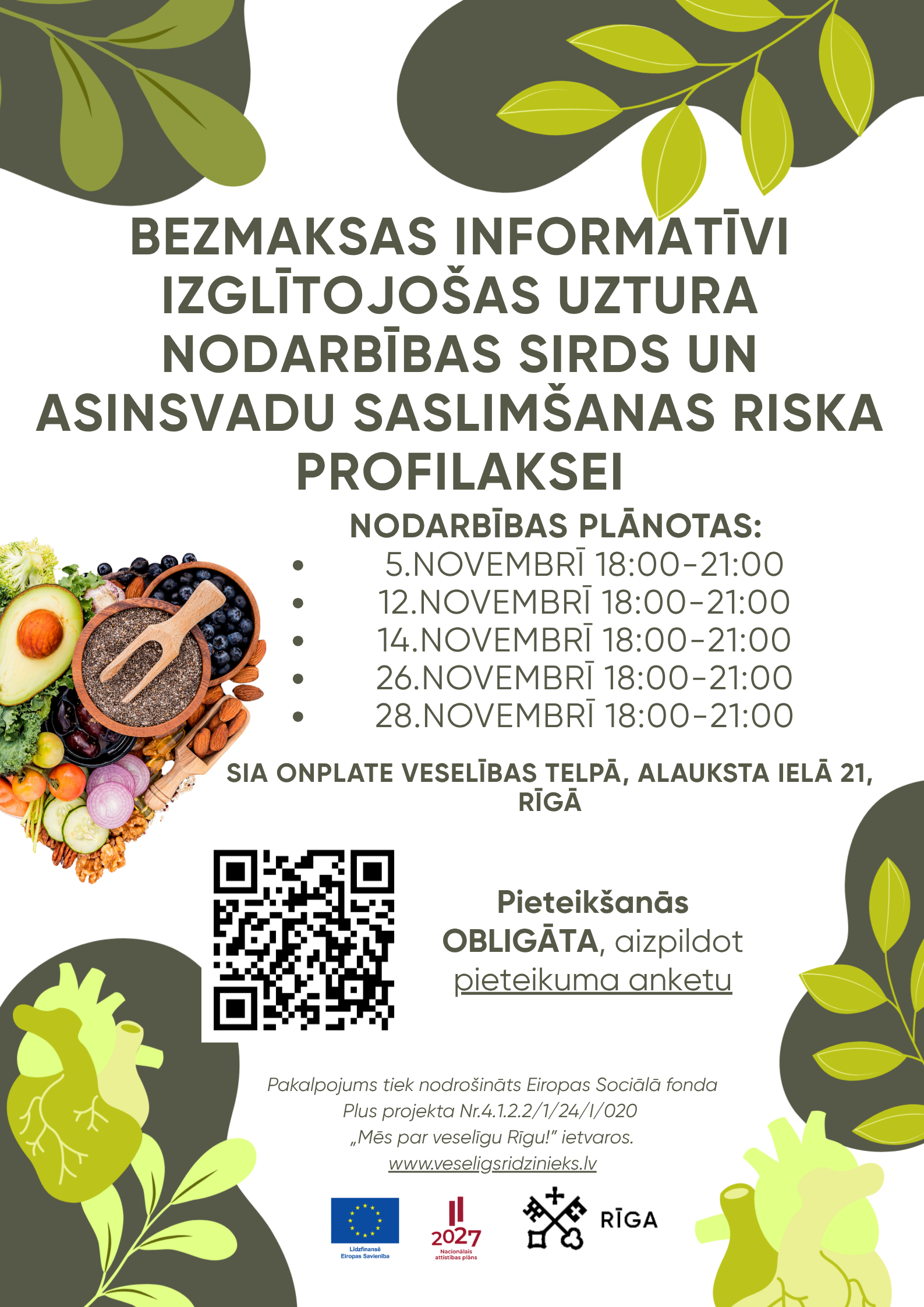 Rīgas valstpilsētas pašvaldības Labklājības departaments sadarbībā ar SIA “OnPlate” aicina Rīgas iedzīvotājus uz bezmaksas informatīvi izglītojošām uztura nodarbībām sirds un asinsvadu saslimšanas riska profilaksei.