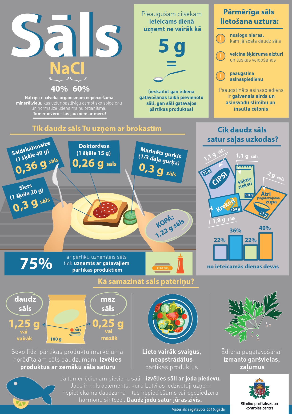 - ierobežo sāls patēriņu līdz 5 gramiem dienā (tas ietver arī gatavajiem produktiem pievienoto sāli);