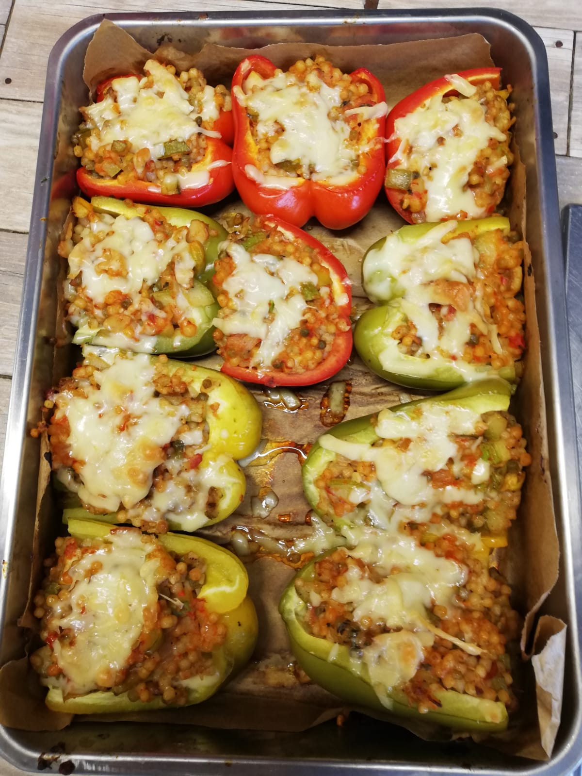Kuskusu izvāra pēc norādījumiem. Sīpolu sasmalcina, sēnes un cukīnī sagriež kubiņos. Divās ēdamkarotēs eļļas apcep sīpolus, liek klāt pārējos sagrieztos produktus, pievieno sāli un piparus, apmaisot, īsu brīdi cep. Noņem no uguns, liek klāt un iemaisa kuskusu, mazos kubiņos sagrieztu tomātu un sasmalcinātas piparmētras. Paprikām nogriež pamatnes, tās saglabājot. Paprikas iztīra, liek ietaukotā cepamveidnē, pilda ar sagatavoto maisījumu. Sieru sarīvē skaidiņās, pārber pildījumam, virsū liek nogrieztās pamatnītes. Veidni liek krāsnī, 200 grādos cep 25 – 30 minūtes līdz paprikas ir mīkstas.