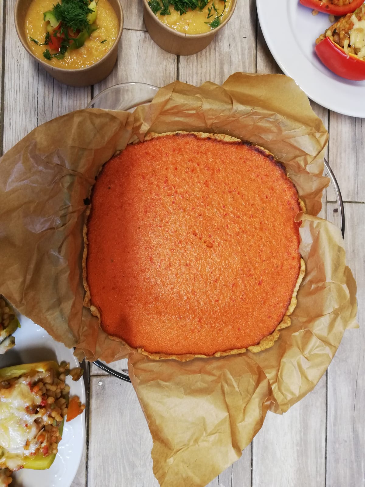 Kad dārzeņi ir gatavi, krāsnī liek veidni ar mīklu, cep viegli zeltainu 15 – 20 minūtes 180°C. Ceptos dārzeņus kopā ar 1 ēdamkaroti eļļas, tomātu pastu, timiānu sablendē. Sakuļ olas ar šķipsniņu sāls un malto papriku. Iemaisa sablendēto maisījumu, sajauc viendabīgu. Pildījumu lej pusceptajā mīklā. Temperatūru krāsnī paaugstina līdz 190 grādiem, liek iekšā tarti, cep 35 – 40 minūtes. Atdzesē pilnīgi, tad izņem no veidnes, griež gabalos.