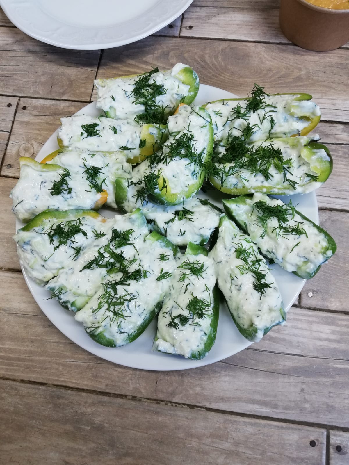 Paprikām nogriež cepurīti, iztīra sēkliņas. Sieru sarīvē, pievieno biezpienu, sagrieztu ķiploku, sāli, piparus un visu masu sablenderē. Pievieno sarīvētus gurķus un sagrieztas dilles – visu kārtīgi samaisa. Ar iegūto masu pilda paprikas un liek uz 10 – 15 minūtēm ledusskapī. Pēc tam sagriež līdz 1 cm biezās ripiņās un pasniedz.