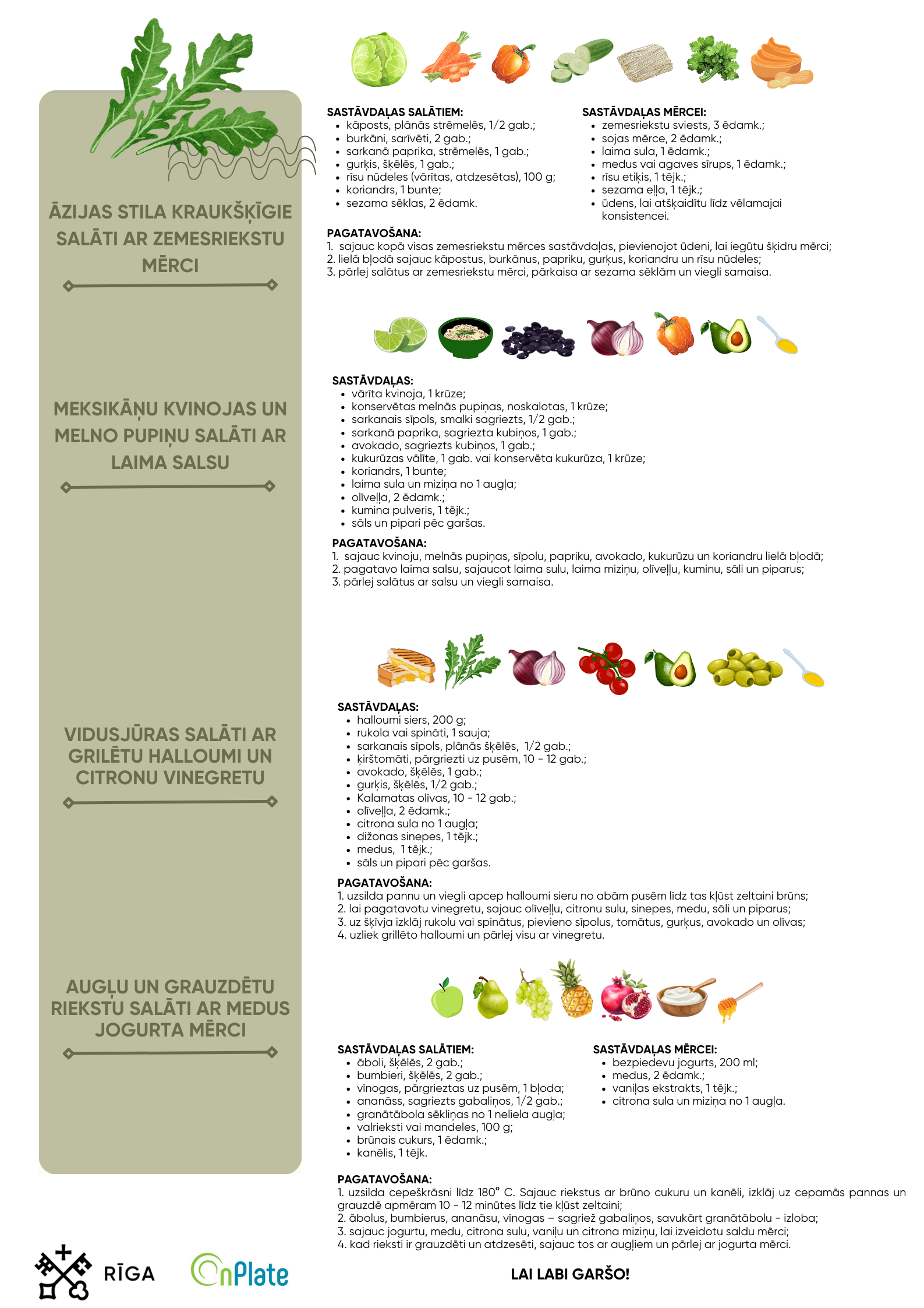 8. marts 2026 Receptes no gatavošanas meistarklases Aicinām iepazīties un izmēģināt receptes no gatavošanas meistarklases “Apceļo salātu pasauli”, ko Rīgas valstspilsētas pašvaldības Labklājības departaments organizē sadarbībā ar SIA “OnPlate”.