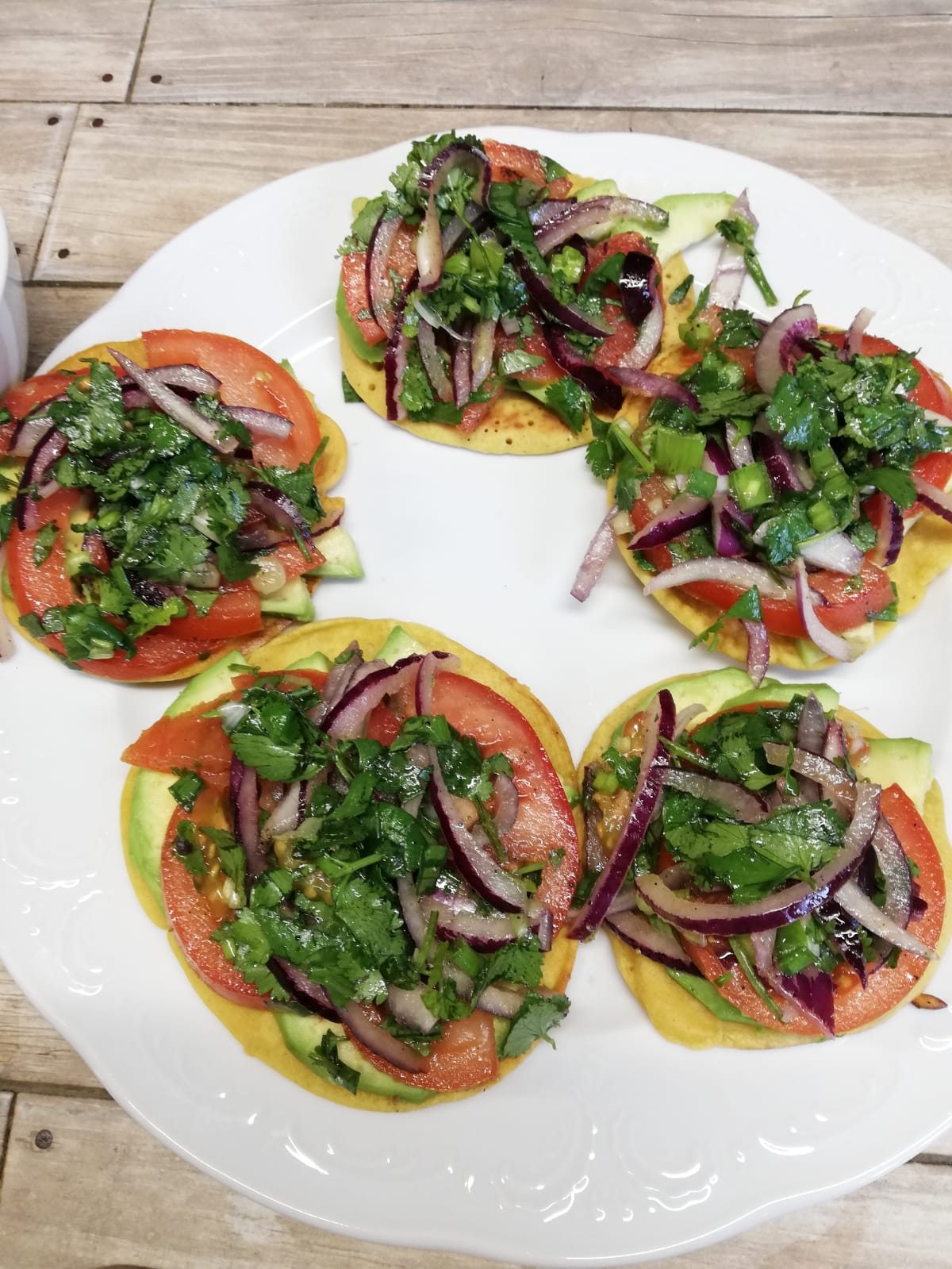 Sagriež tomātu, sīpolu, sasmalcina koriandru, pārkaisa ar sāli, pipariem, pārlej ar olīveļļu un samaisa. Avokado pārgriež uz pusēm, atbrīvo no kauliņa un sagriež šķēlēs. Sasmalcina lociņus. Veido picu: liek pankūku, virsū avokado šķēles, ko apslaka ar citrona sulu, virsū liek salātus, uzber lociņus un virsū glīti kārto olu. Pārber mazliet piparus un sāli. Klāt pasniedz svaigus dīgstus.