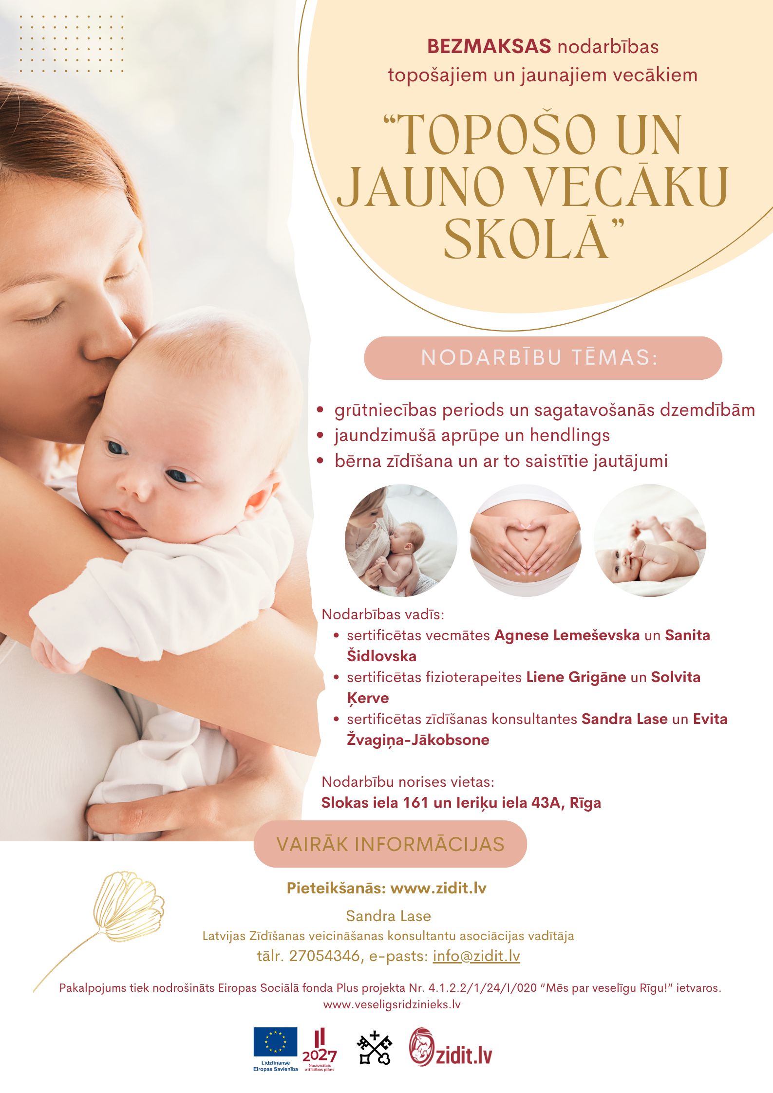 Papildus informāciju par nodarbību tēmām, laikiem un to, kā pieteikties nodarbībām, var iegūt Latvijas Zīdīšanas veicināšanas konsultantu asociācijas mājas lapā www.zidit.lv. Iepriekšēja pieteikšanās nodarbībām ir OBLIGĀTA! (vietu skaits ir ierobežots).