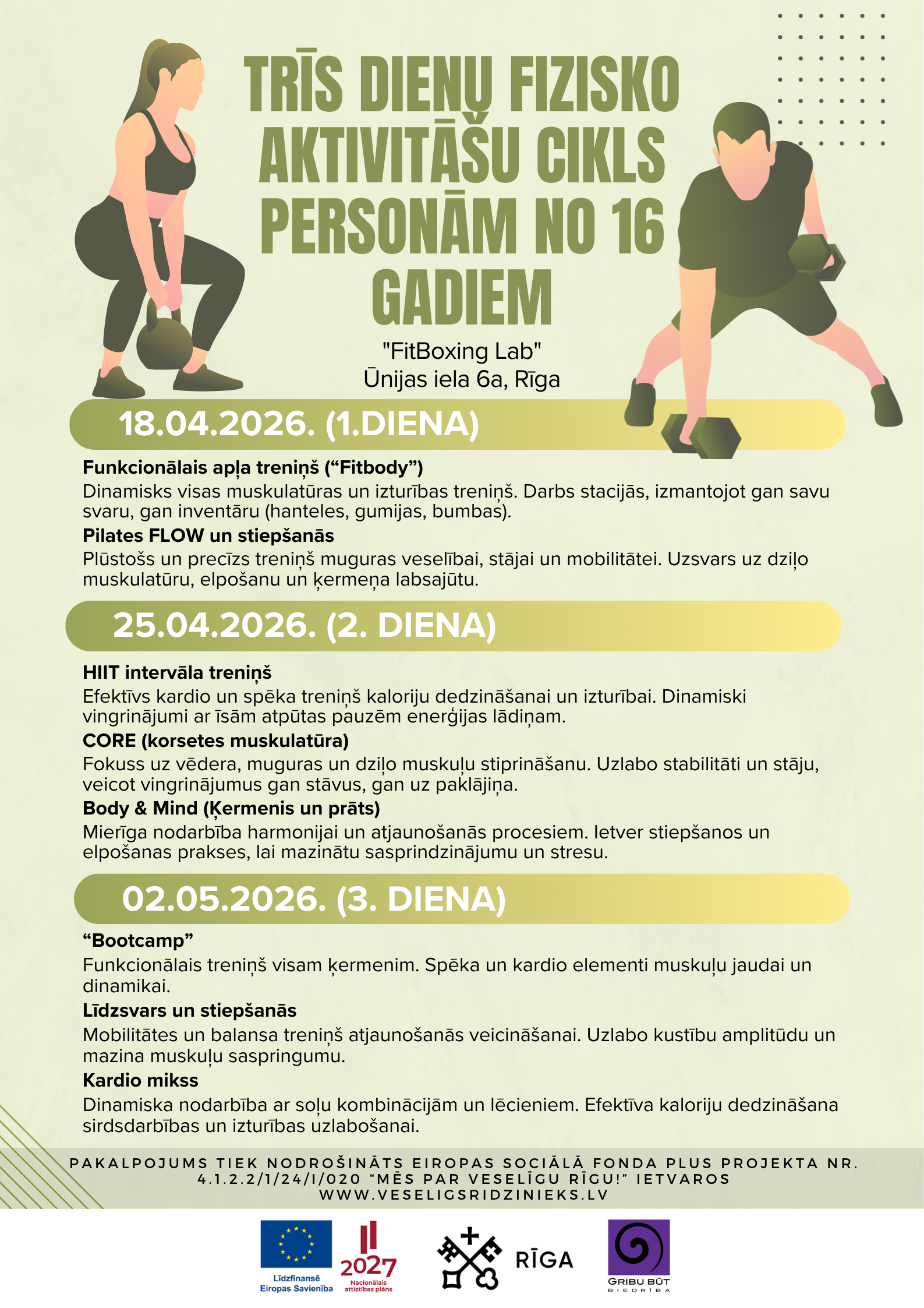 Rīgas valstspilsētas pašvaldības Labklājības departaments sadarbībā ar “GRIBU BŪT” Dzīves kvalitātes uzlabošanas un veselības veicināšanas biedrību aicina iedzīvotājus piedalīties BEZMAKSAS nodarbībās “Trīs dienu fizisko aktivitāšu cikls personām no 16 gadiem”, būt aktīviem, iesaistīties fiziskajās aktivitātēs, apgūt jaunas prasmes, uzlabot fizisko un psihoemocionālo veselību un mazināt veselības riska faktorus.