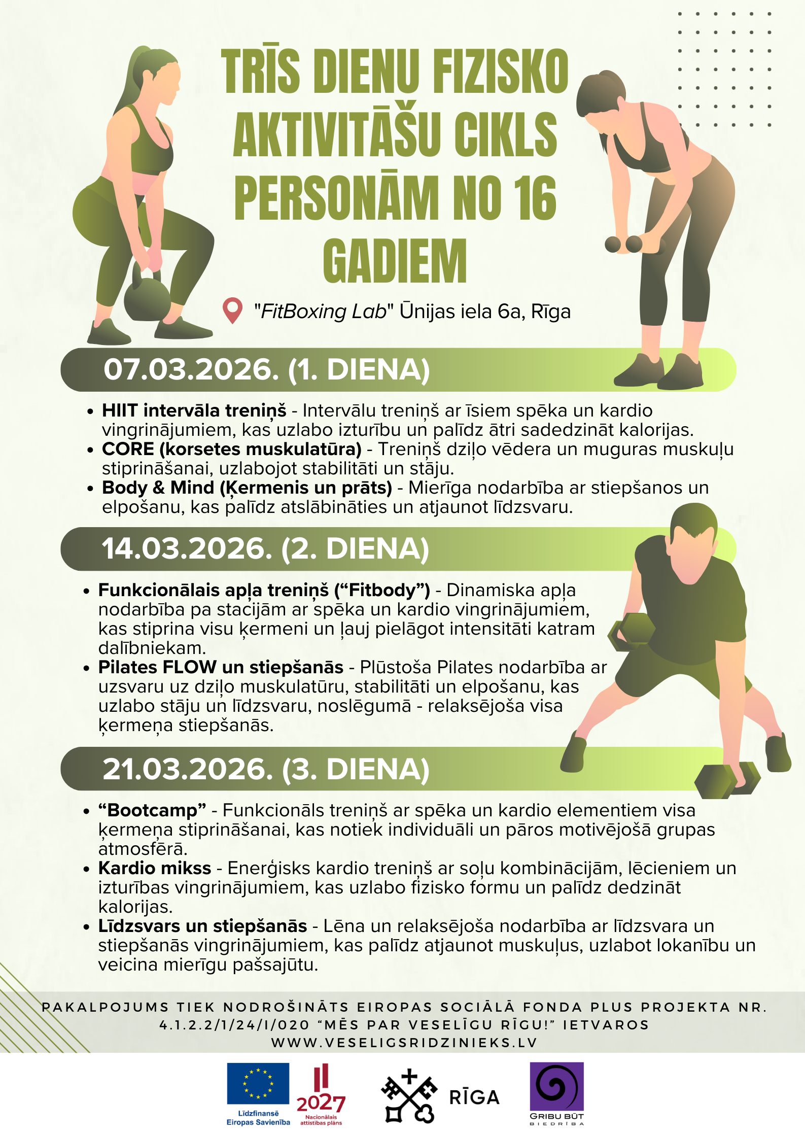 Rīgas valstspilsētas pašvaldības Labklājības departaments sadarbībā ar “GRIBU BŪT” Dzīves kvalitātes uzlabošanas un veselības veicināšanas biedrību aicina Rīgas iedzīvotājus piedalīties bezmaksas nodarbībās “Trīs dienu fizisko aktivitāšu cikls personām no 16 gadiem”, būt aktīviem, iesaistīties fiziskajās aktivitātēs, apgūt jaunas prasmes, uzlabot fizisko un psihoemocionālo veselību un mazināt veselības riska faktorus.