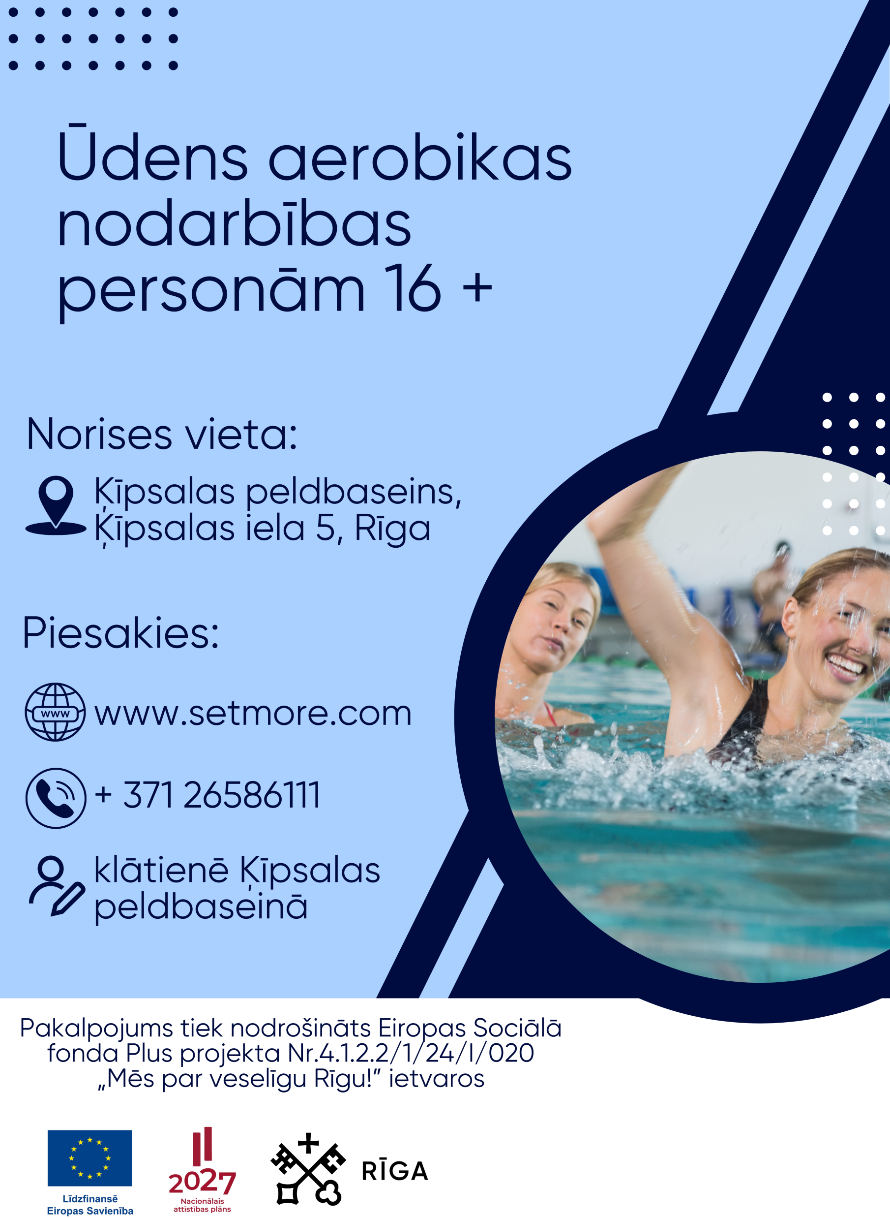 - Pieteikšanās uz bezmaksas ūdens aerobikas nodarbībām tiek atvērta katra mēneša 15. datumā.