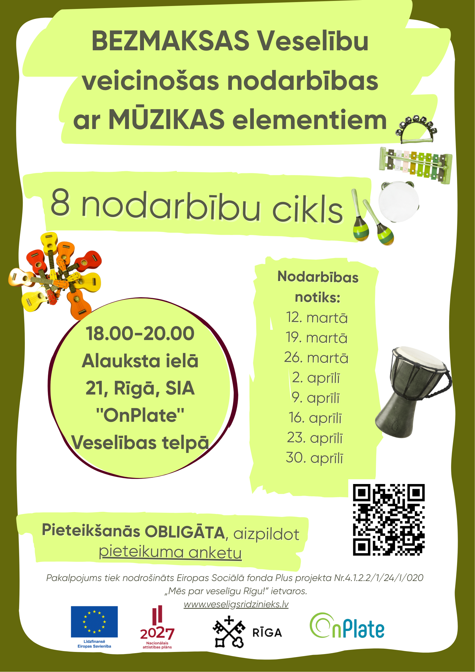 Rīgas valstspilsētas pašvaldības Labklājības departaments sadarbībā ar SIA “OnPlate” aicina Rīgas iedzīvotājus uz bezmaksas nodarbību ciklu ar MŪZIKAS elementiem.